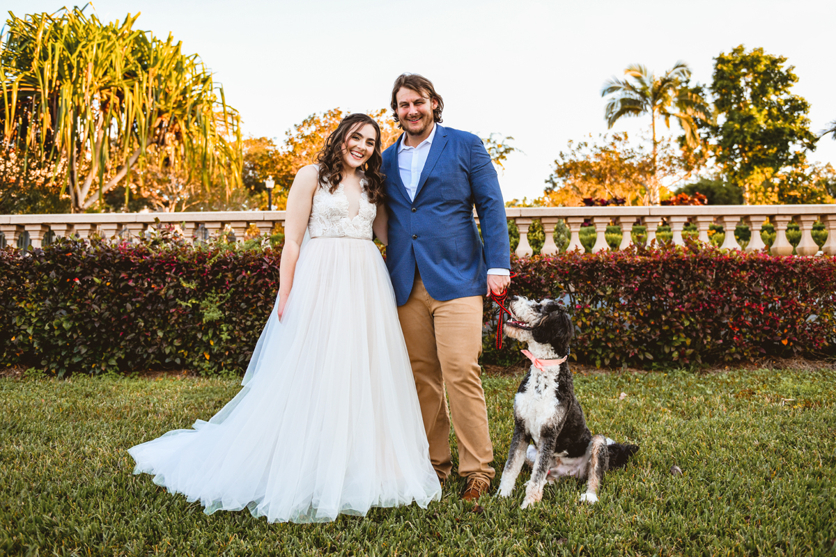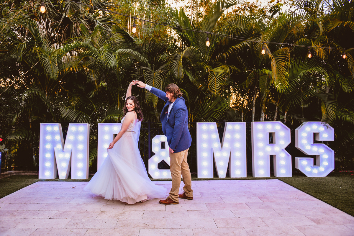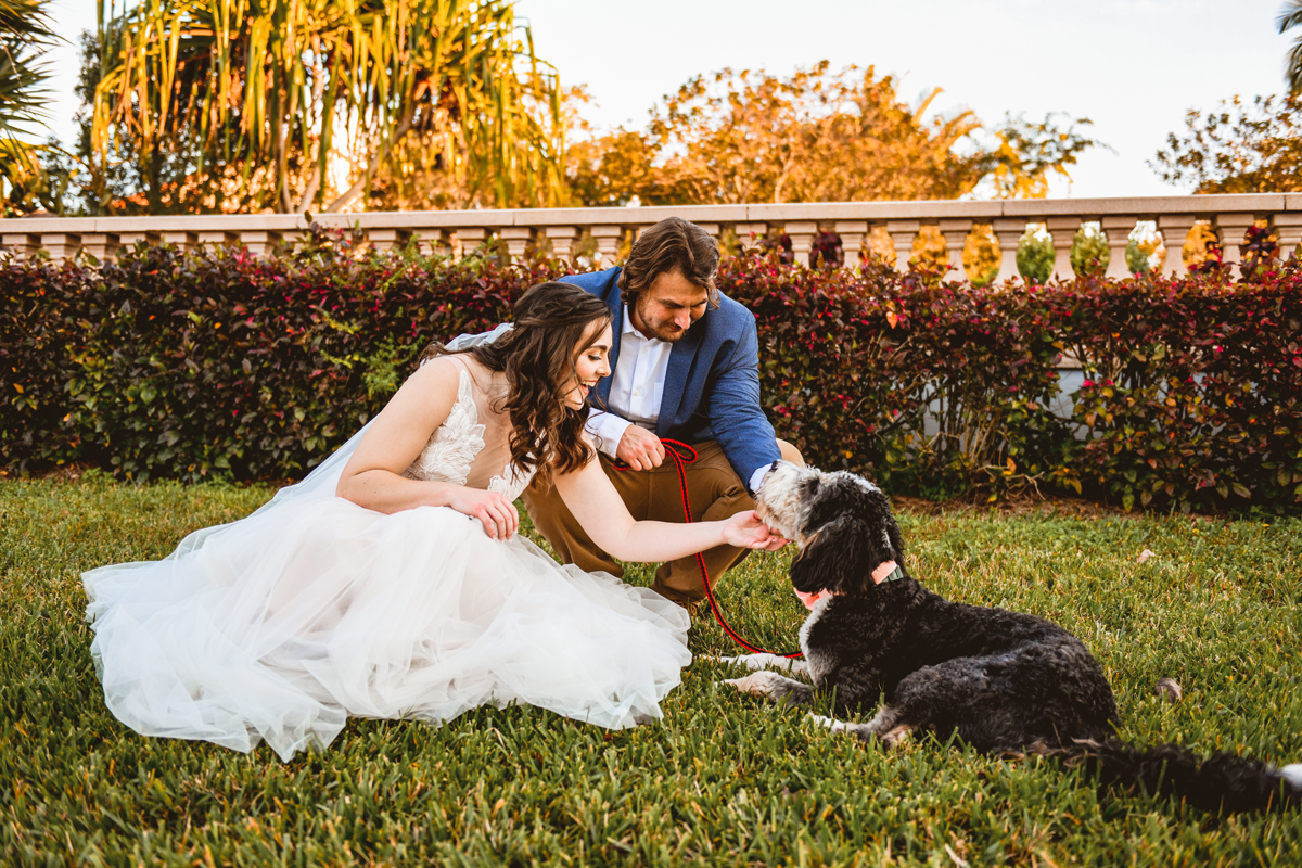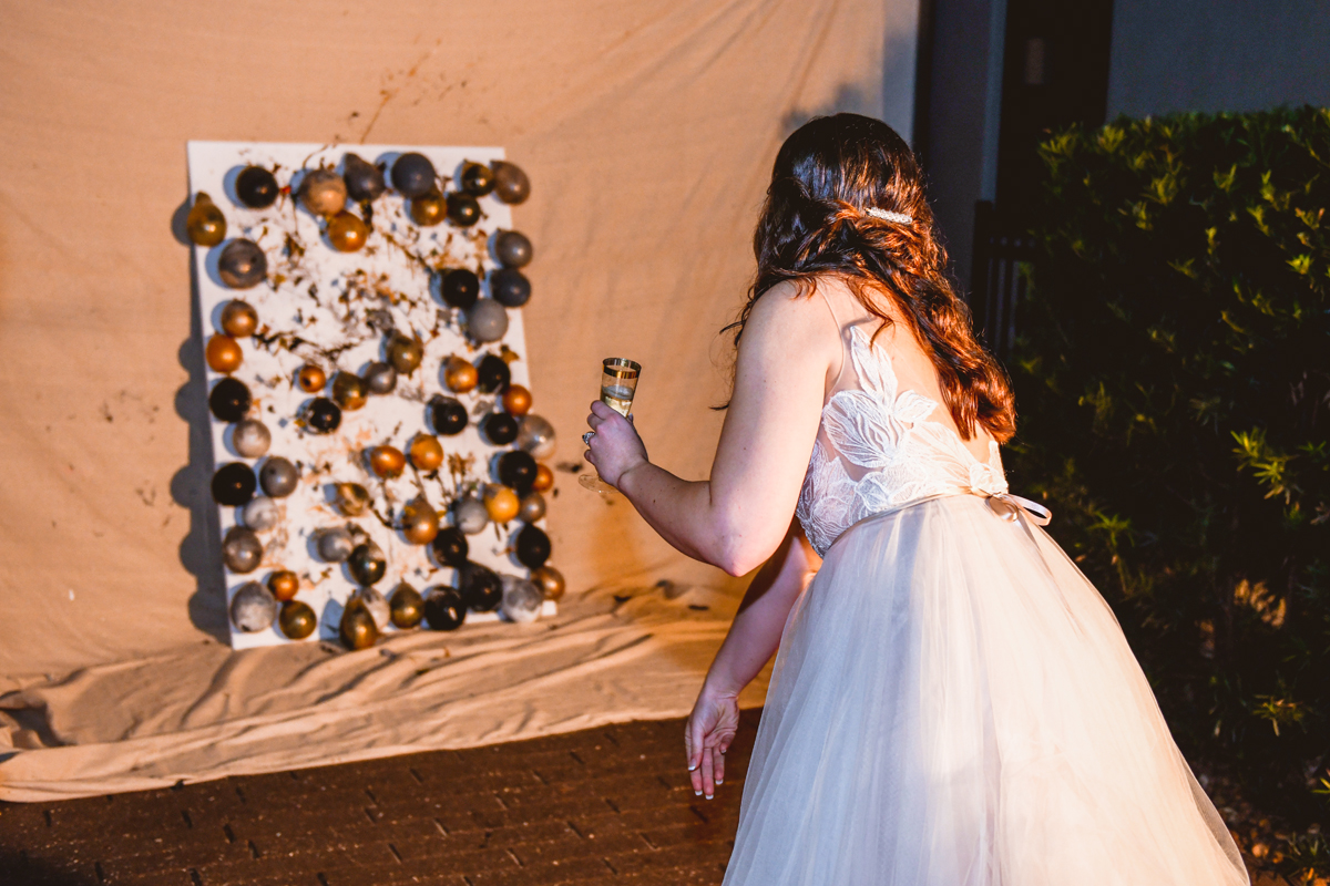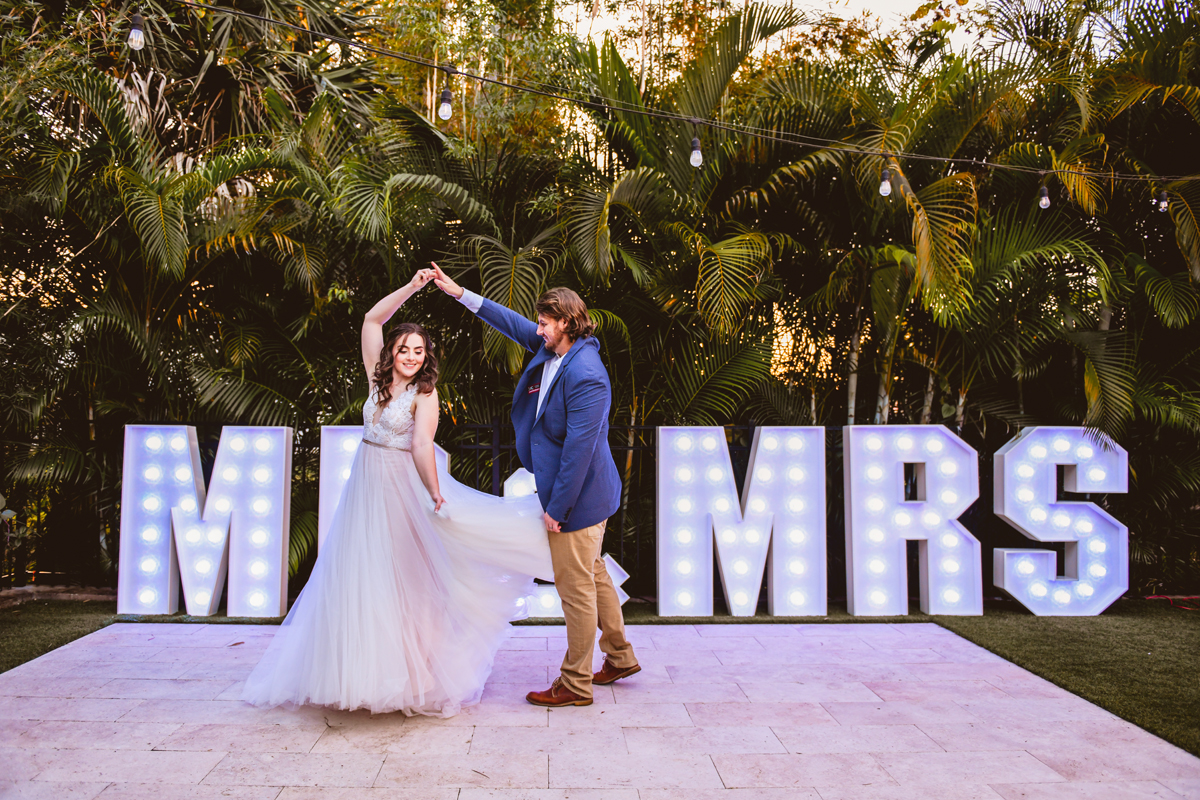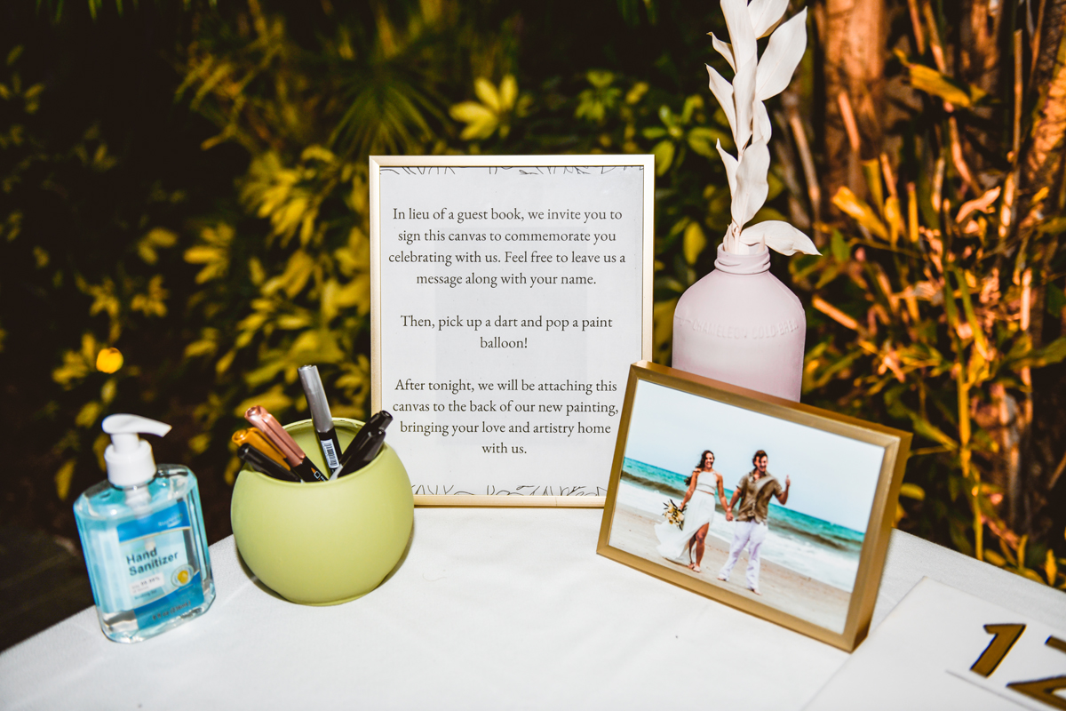 A day a year and a half in the making and we finally made it! The backstory: Rhiannan and Kyle were planning their wedding day for 2020 and maybe you can guess what happens next… oh yeah COVID. Since Rhiannan’s family isn’t local to Florida they wouldn’t be able to make it Florida for their original wedding date. So instead of postponing the wedding or celebrating without Rhiannan’s side of the family, they chose to split their wedding day into two parts! The first part was an elopement in Vero Beach with just Rhiannan, Kyle, the officiant, me, and the ocean. Even though it might have been the windiest day of the year, it was still the perfect day capturing Rhiannan and Kyle become Mr. & Mrs. Hulbert. Fast forward to 2021, it was time to throw the celebration part of their wedding day which brings us to round two! I met up with Rhiannan and Kyle at Hollis Garden for their family and wedding portraits and I got to put on my Lakeland wedding photographer shoes. Even though we got locked outside of the garden we still made the best of it by taking portraits around the area which was still perfectly picturesque. Once we finished, we headed back to Kyle’s family home where the party would be taking place. Rhiannan and Kyle did such an amazing job transforming the house into an ideal indoor/outdoor space for a wedding. Champagne, a table filled with food and desserts galore were lined with greenery centerpieces and photos from their elopement the year before. The outside space featured a bar, photo booth, dance floor, yard games, beer pong, blackjack and roulette! Which were run by professional dealers and was a big hit throughout the night. I think one of my favorite details was the guest “book”. Rhiannan and Kyle set up a huge canvas with paint-filled balloons for guests to throw darts at which created it’s own unique abstract art piece once all the balloons were popped. Such a fun idea and now they have a new art piece for the house that all of their friends and family helped them make. Overall this day was perfect for this Lakeland wedding photographer and I’m so happy I got to capture round two for Mr. & Mrs. Hulbert!