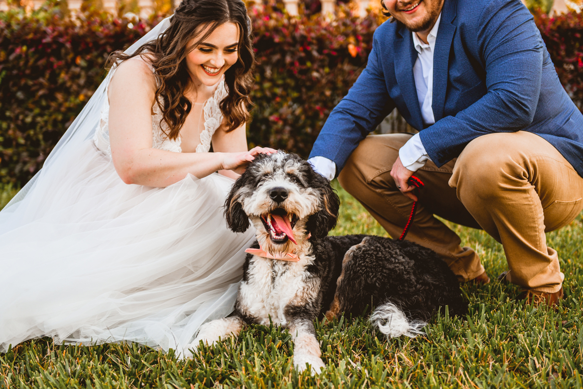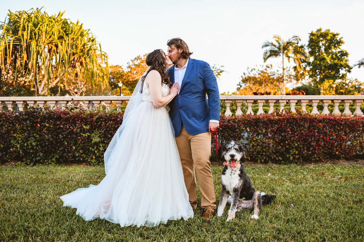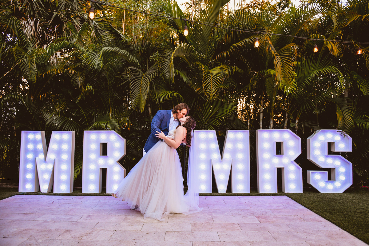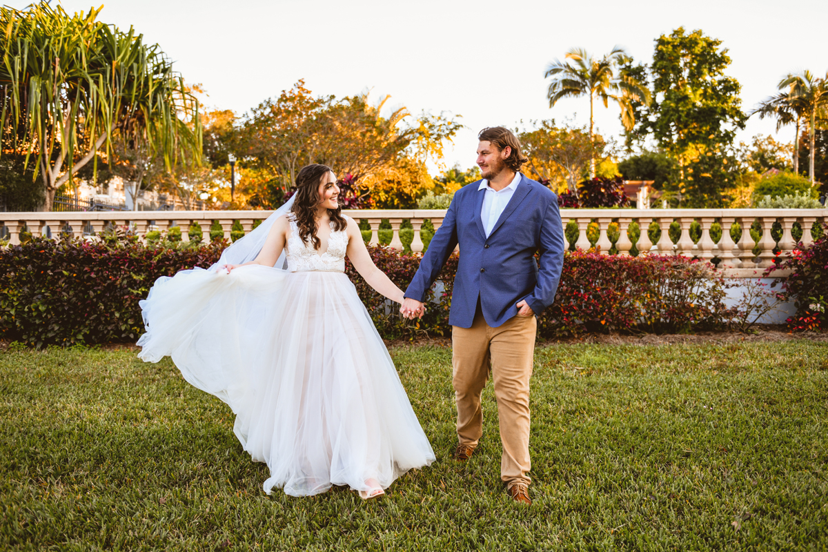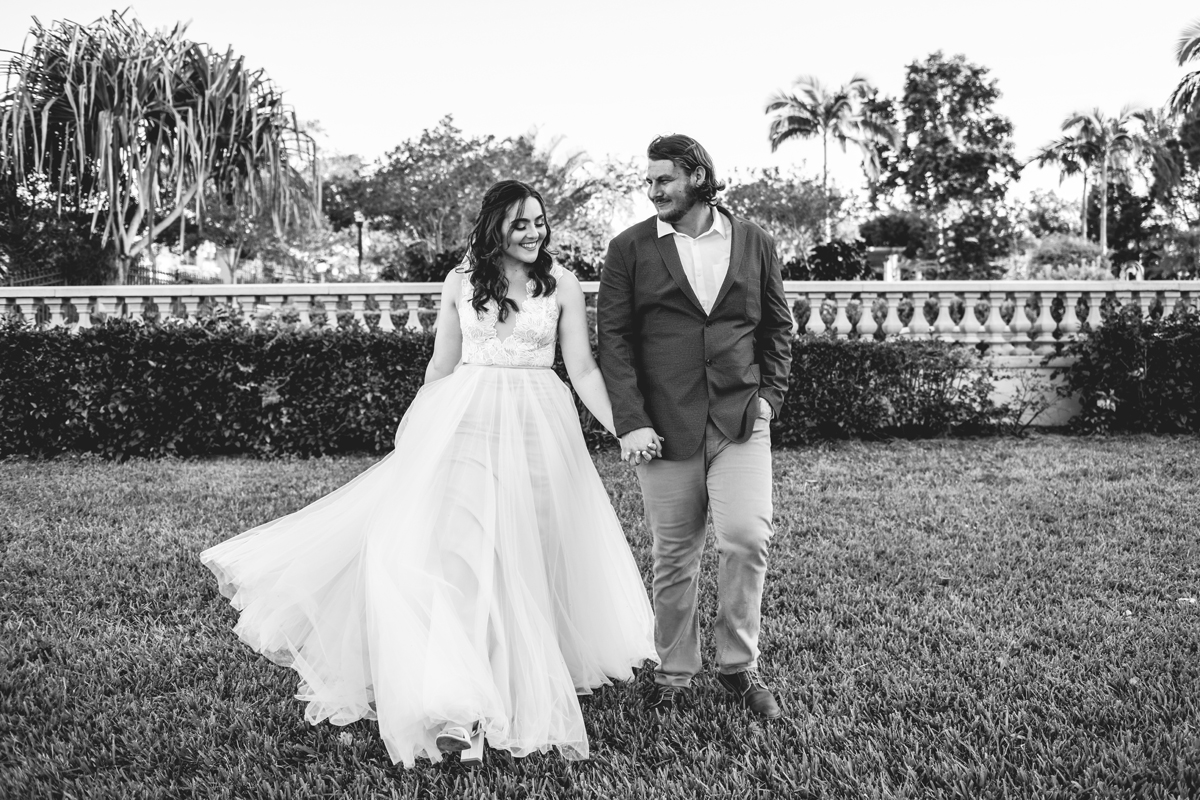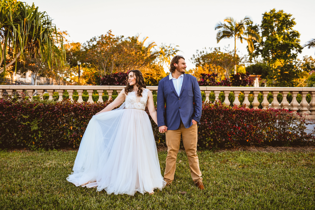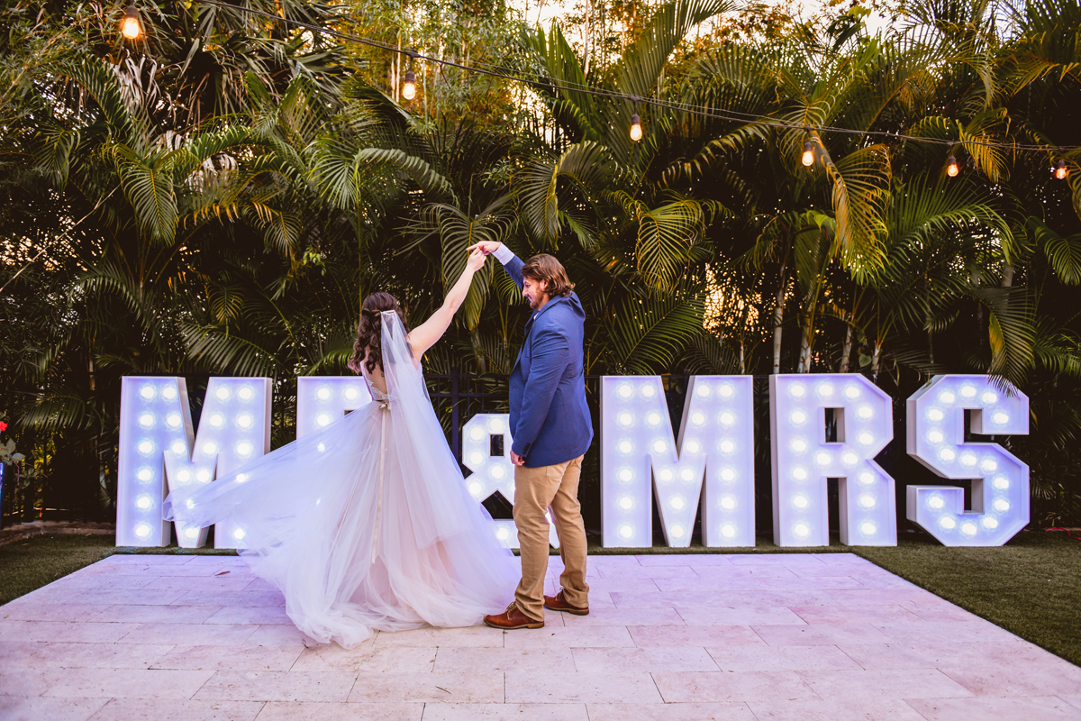 A day a year and a half in the making and we finally made it! The backstory: Rhiannan and Kyle were planning their wedding day for 2020 and maybe you can guess what happens next… oh yeah COVID. Since Rhiannan’s family isn’t local to Florida they wouldn’t be able to make it Florida for their original wedding date. So instead of postponing the wedding or celebrating without Rhiannan’s side of the family, they chose to split their wedding day into two parts! The first part was an elopement in Vero Beach with just Rhiannan, Kyle, the officiant, me, and the ocean. Even though it might have been the windiest day of the year, it was still the perfect day capturing Rhiannan and Kyle become Mr. & Mrs. Hulbert. Fast forward to 2021, it was time to throw the celebration part of their wedding day which brings us to round two! I met up with Rhiannan and Kyle at Hollis Garden for their family and wedding portraits and I got to put on my Lakeland wedding photographer shoes. Even though we got locked outside of the garden we still made the best of it by taking portraits around the area which was still perfectly picturesque. Once we finished, we headed back to Kyle’s family home where the party would be taking place. Rhiannan and Kyle did such an amazing job transforming the house into an ideal indoor/outdoor space for a wedding. Champagne, a table filled with food and desserts galore were lined with greenery centerpieces and photos from their elopement the year before. The outside space featured a bar, photo booth, dance floor, yard games, beer pong, blackjack and roulette! Which were run by professional dealers and was a big hit throughout the night. I think one of my favorite details was the guest “book”. Rhiannan and Kyle set up a huge canvas with paint-filled balloons for guests to throw darts at which created it’s own unique abstract art piece once all the balloons were popped. Such a fun idea and now they have a new art piece for the house that all of their friends and family helped them make. Overall this day was perfect for this Lakeland wedding photographer and I’m so happy I got to capture round two for Mr. & Mrs. Hulbert!