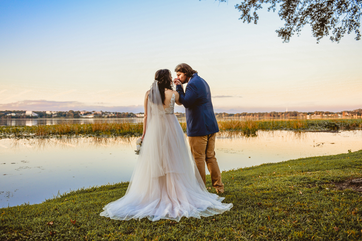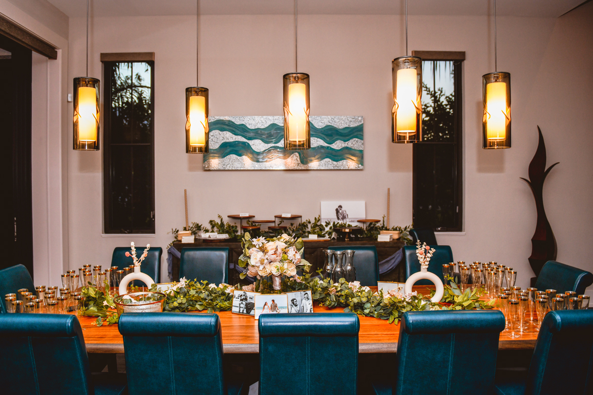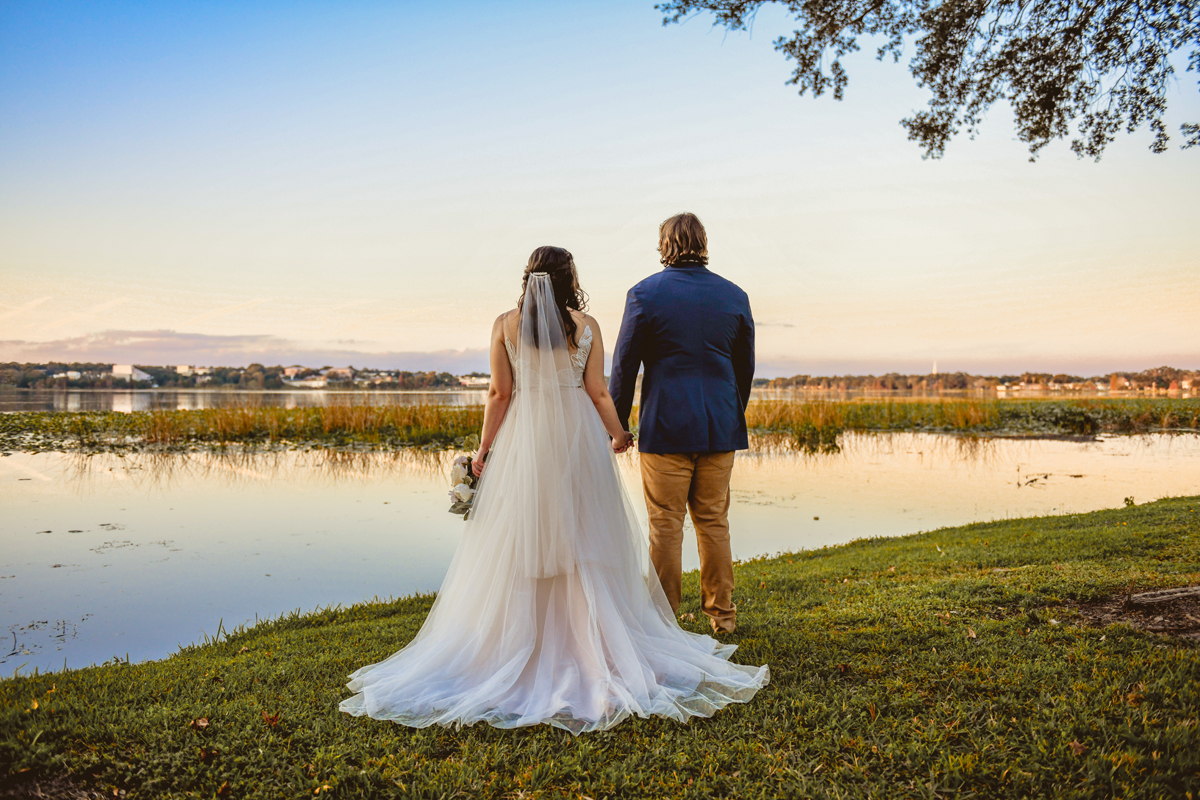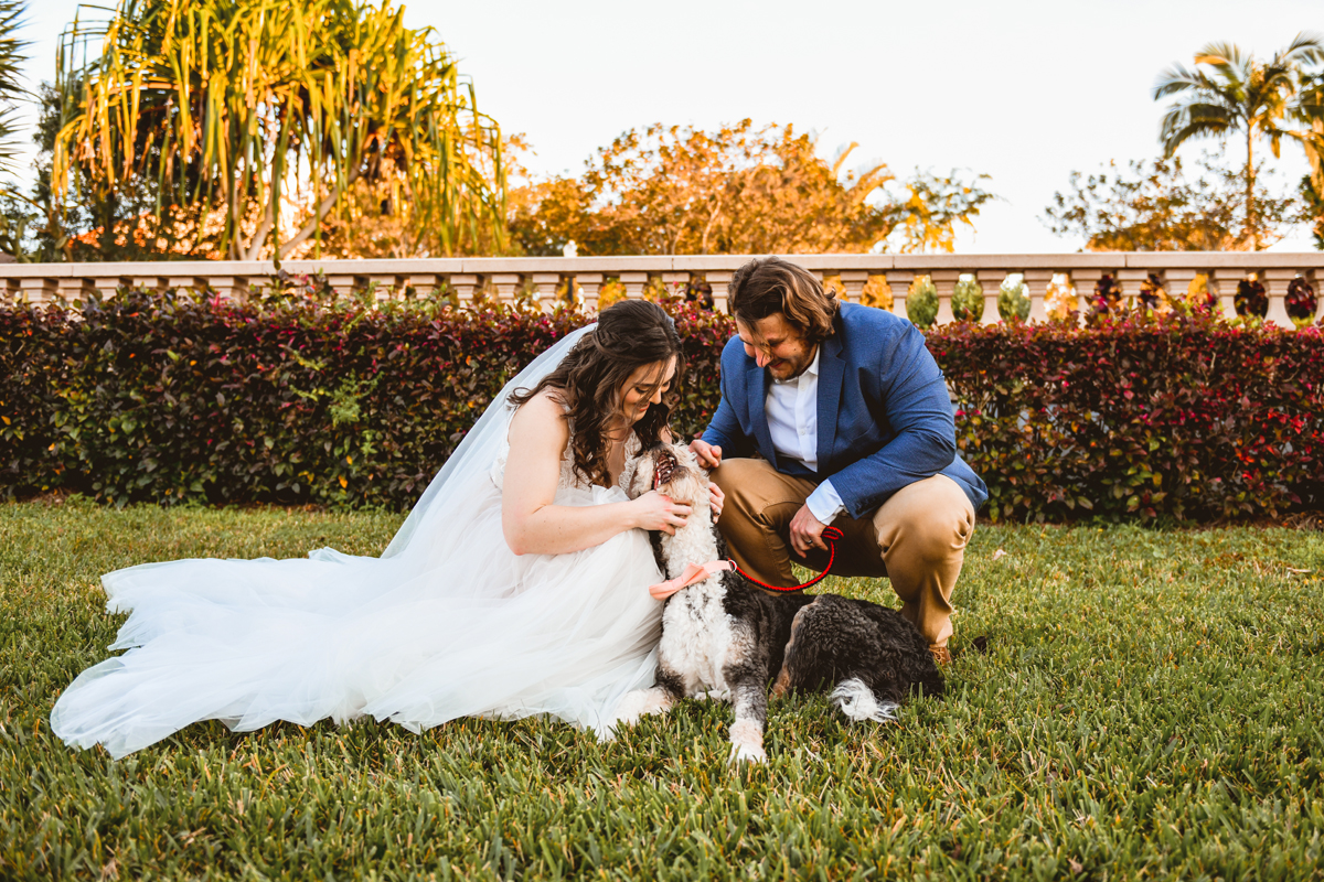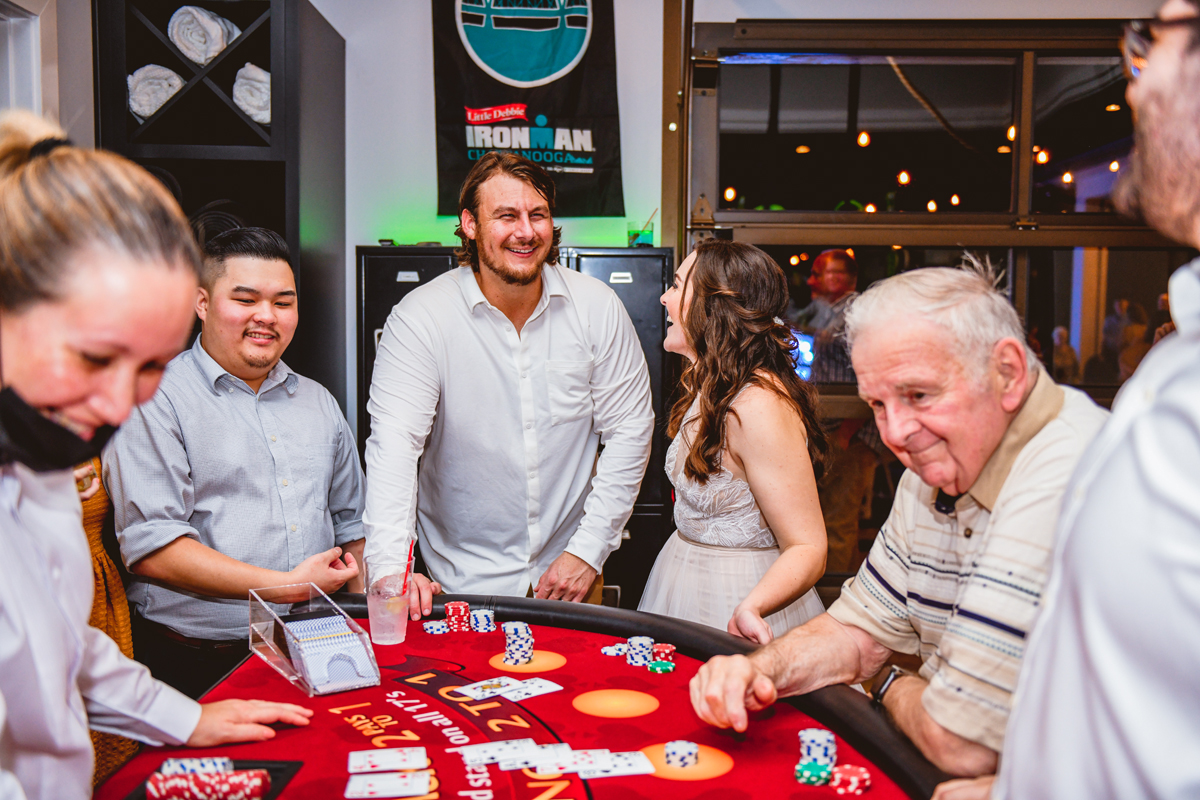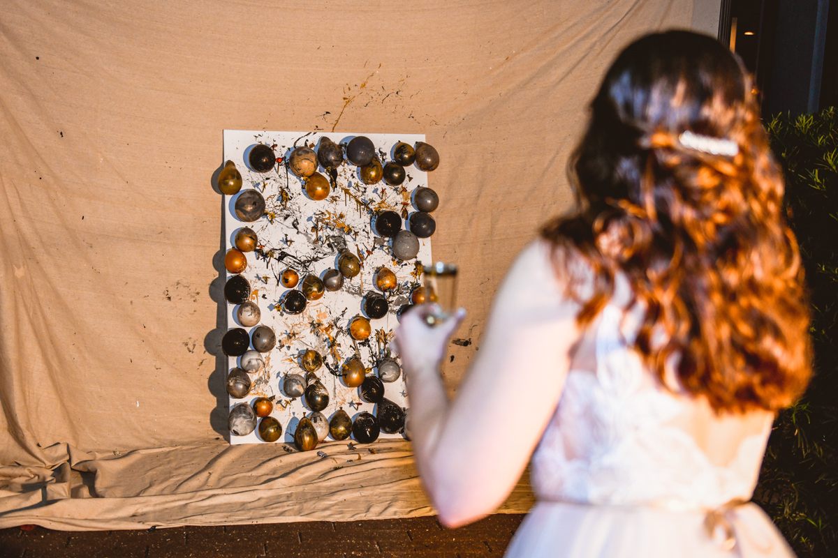 A day a year and a half in the making and we finally made it! The backstory: Rhiannan and Kyle were planning their wedding day for 2020 and maybe you can guess what happens next… oh yeah COVID. Since Rhiannan’s family isn’t local to Florida they wouldn’t be able to make it Florida for their original wedding date. So instead of postponing the wedding or celebrating without Rhiannan’s side of the family, they chose to split their wedding day into two parts! The first part was an elopement in Vero Beach with just Rhiannan, Kyle, the officiant, me, and the ocean. Even though it might have been the windiest day of the year, it was still the perfect day capturing Rhiannan and Kyle become Mr. & Mrs. Hulbert. Fast forward to 2021, it was time to throw the celebration part of their wedding day which brings us to round two! I met up with Rhiannan and Kyle at Hollis Garden for their family and wedding portraits and I got to put on my Lakeland wedding photographer shoes. Even though we got locked outside of the garden we still made the best of it by taking portraits around the area which was still perfectly picturesque. Once we finished, we headed back to Kyle’s family home where the party would be taking place. Rhiannan and Kyle did such an amazing job transforming the house into an ideal indoor/outdoor space for a wedding. Champagne, a table filled with food and desserts galore were lined with greenery centerpieces and photos from their elopement the year before. The outside space featured a bar, photo booth, dance floor, yard games, beer pong, blackjack and roulette! Which were run by professional dealers and was a big hit throughout the night. I think one of my favorite details was the guest “book”. Rhiannan and Kyle set up a huge canvas with paint-filled balloons for guests to throw darts at which created it’s own unique abstract art piece once all the balloons were popped. Such a fun idea and now they have a new art piece for the house that all of their friends and family helped them make. Overall this day was perfect for this Lakeland wedding photographer and I’m so happy I got to capture round two for Mr. & Mrs. Hulbert!