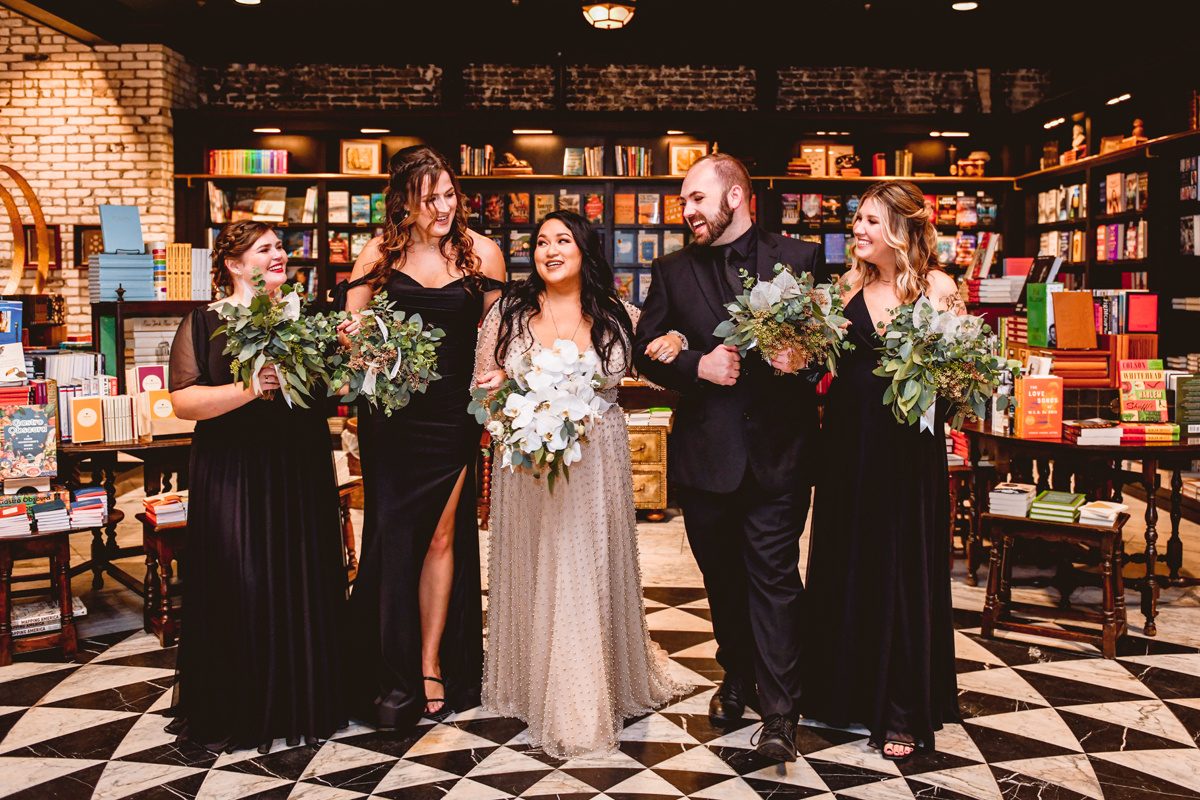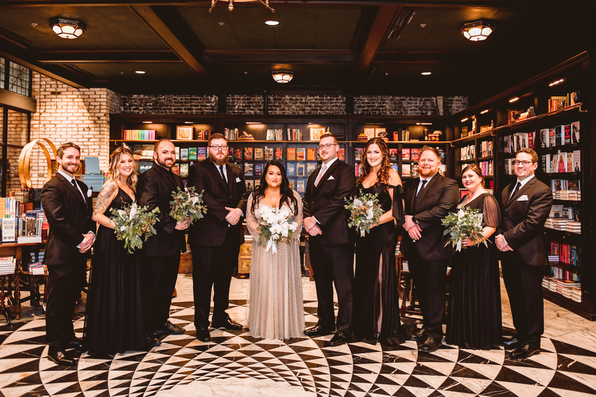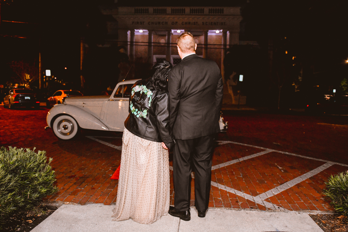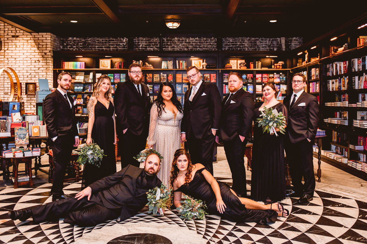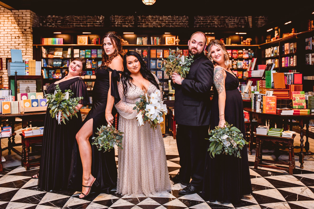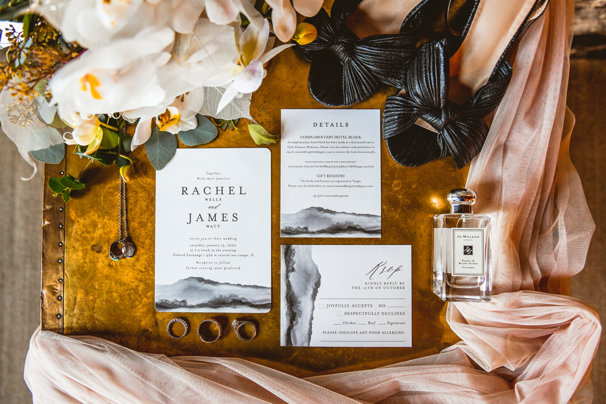 An Oxford Exchange wedding has been on my bucket list of venues to shoot at since I started photographing in the Tampa Bay area. Who hasn’t gone to brunch at Oxford without becoming completely enthralled with every single detail this magical building has to offer? I could only imagine how amazing it would be to photograph a wedding there and then Rachel and Jim stepped into the picture and elevated it. The backstory: I met Rachel a couple of years ago at the salon where we were both getting our hair done. With our hair in and out of processing for 6 hours, there wasn’t much to do but snack and chat so we did! It’s hard to believe meeting Rachel that day would lead me to their wedding day so many years later! I first got to work with Rachel and Jim for their engagement session at Philippe Park. This was just a little insight into what I could expect on their big day and I was super excited. Rachel and I have very similar taste when it comes to style and vibe. We love unique elements all things dark and moody so I knew whatever Rachel had planned for her Oxford Exchange wedding day was going to be something straight from my personal Pinterest board and I wasn’t wrong. From her stunning cream, beaded wedding gown, to the black bridesmaid dresses and cake, Rachel was pulling on all my heart strings. Utilizing all of what Oxford Exchange had to offer for their portraits paired with Rachel’s unique sense of style was truly *chefs kiss*. My favorite part of the evening was when all the guests lined up with confetti poppers as Mr. & Mrs. Watt exited into a luxury car that drove them away into the night. It doesn’t get much better than that folks!