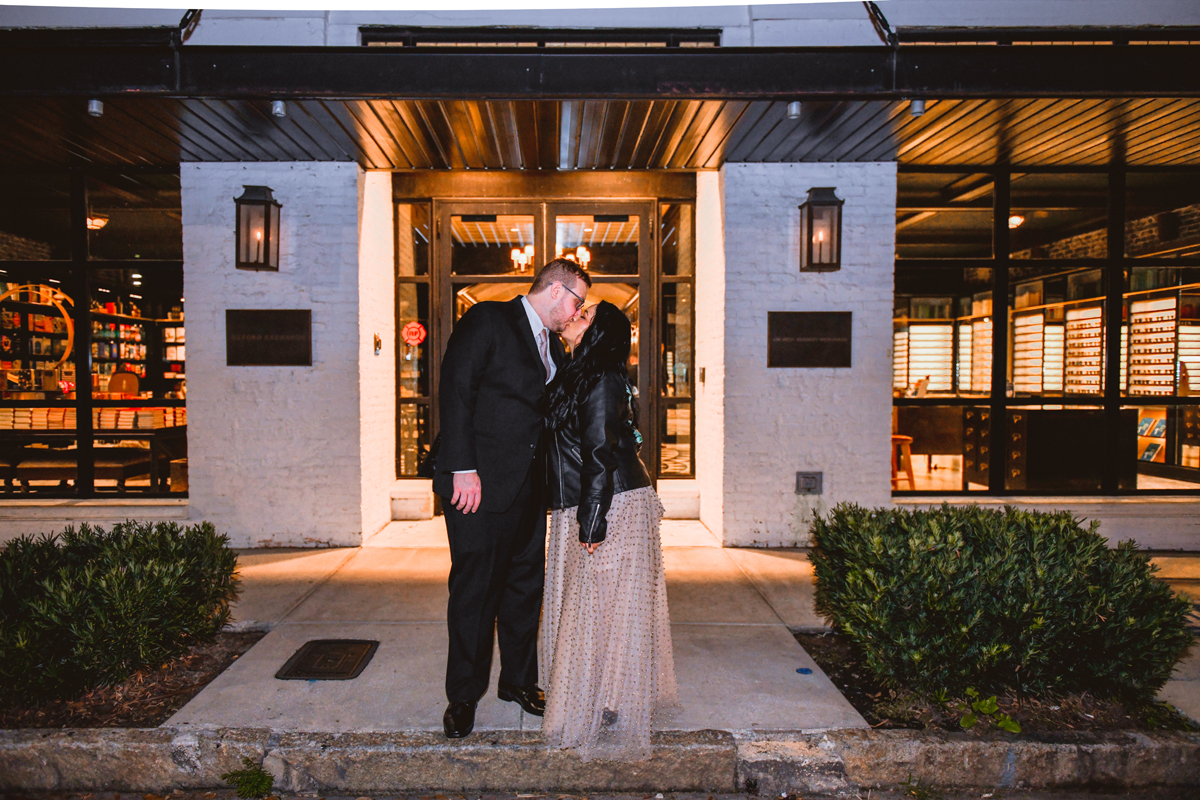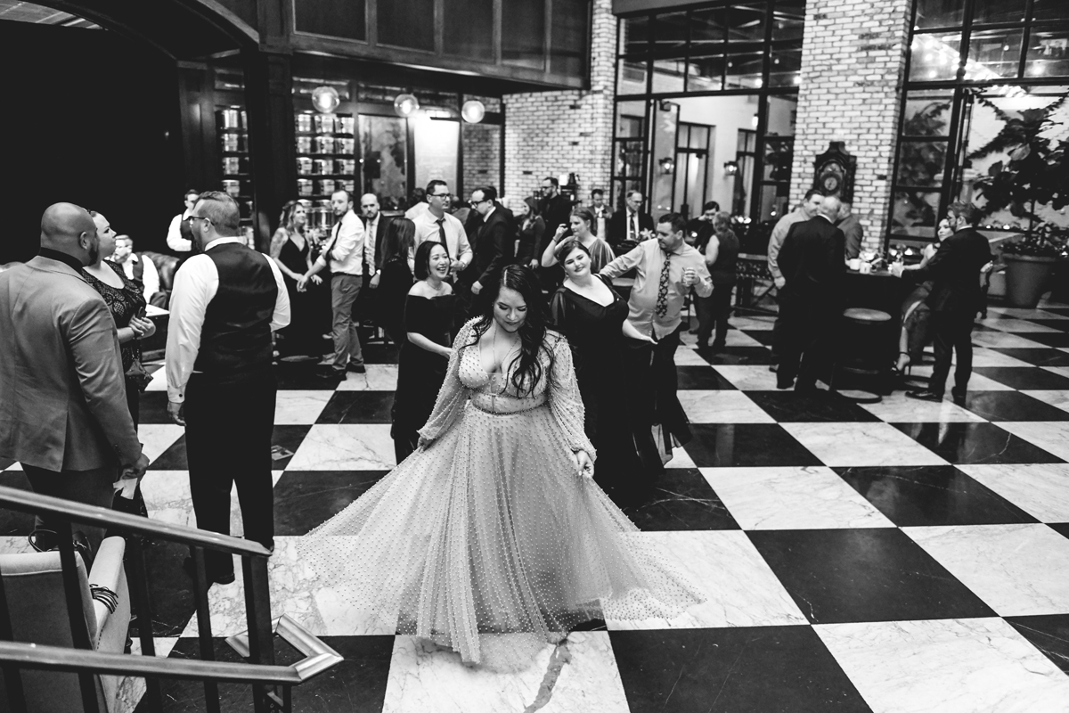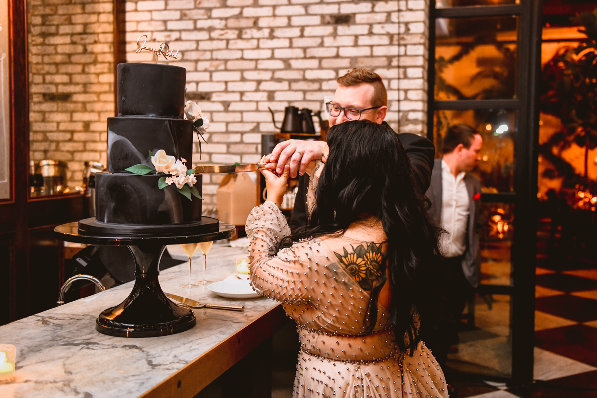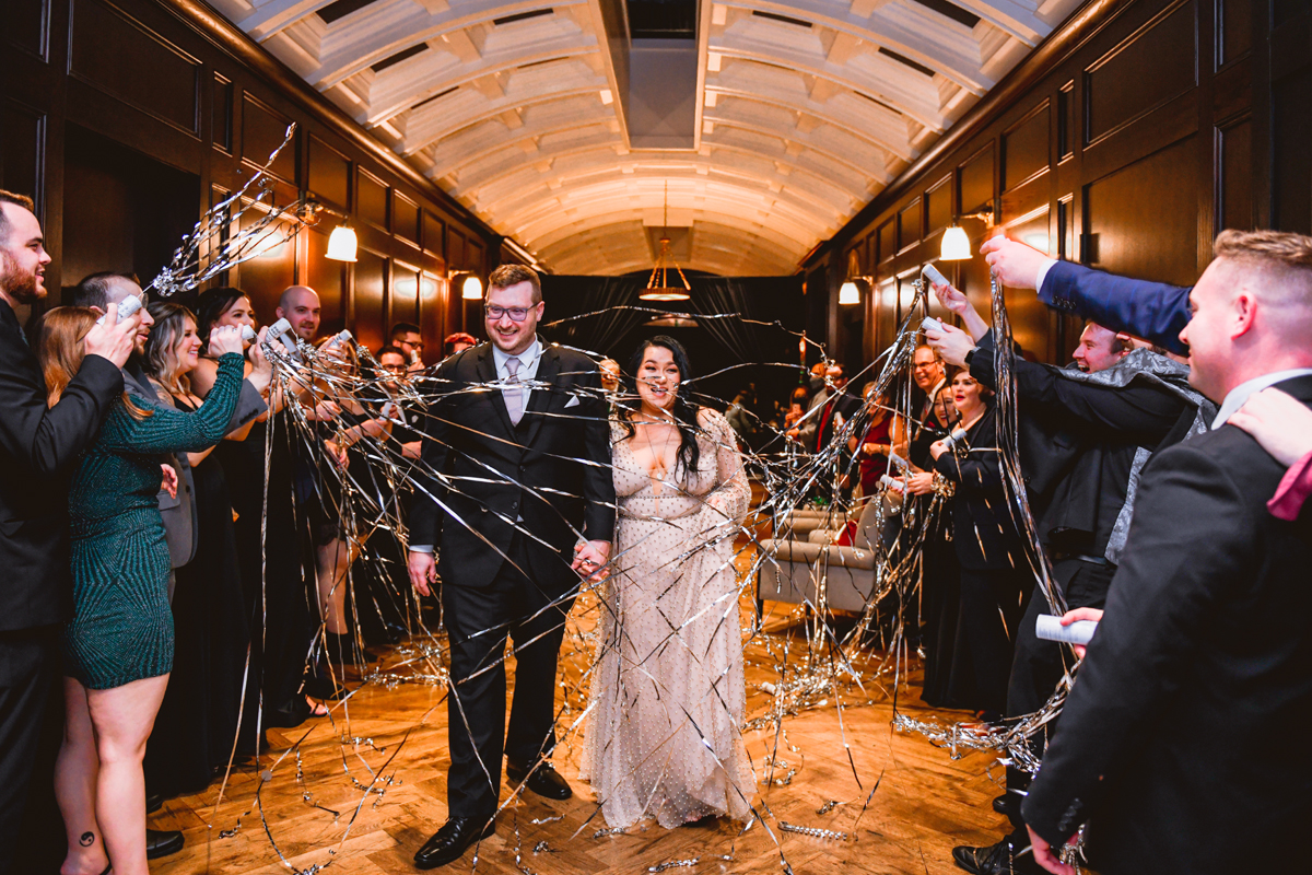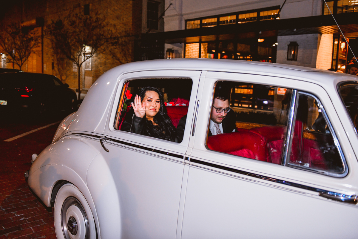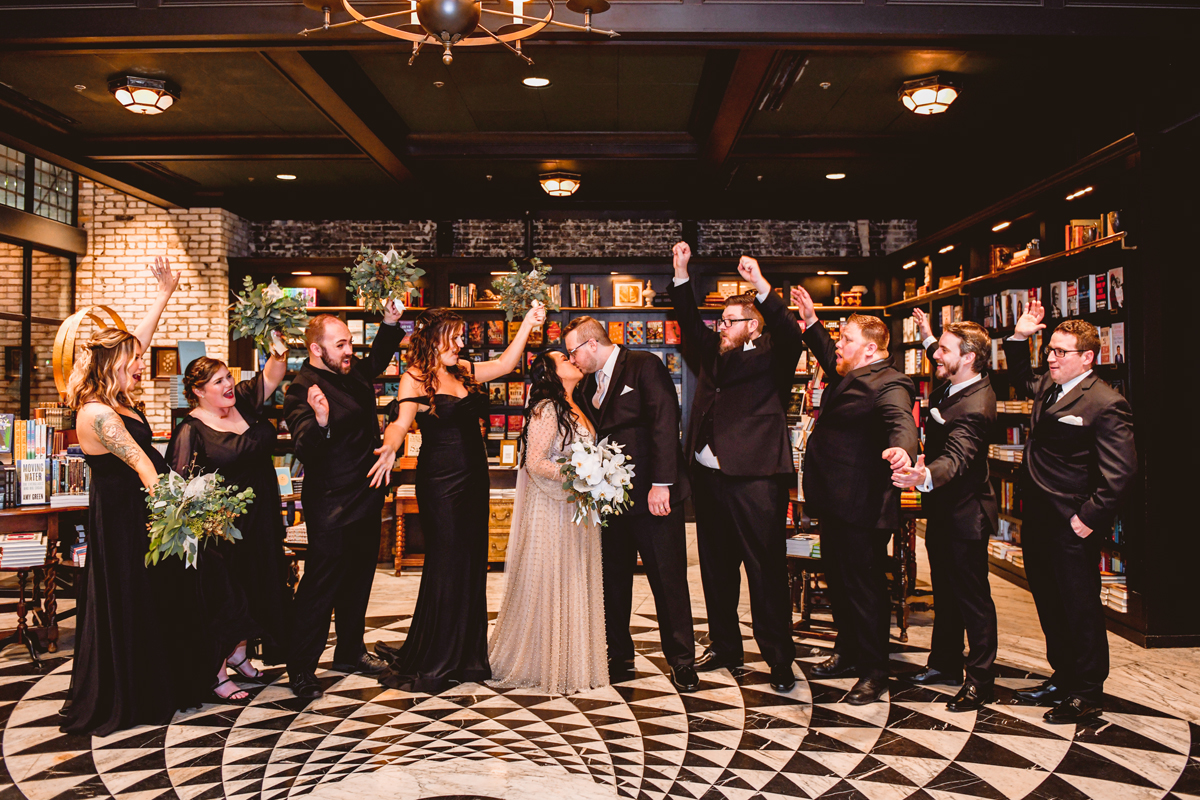 An Oxford Exchange wedding has been on my bucket list of venues to shoot at since I started photographing in the Tampa Bay area. Who hasn’t gone to brunch at Oxford without becoming completely enthralled with every single detail this magical building has to offer? I could only imagine how amazing it would be to photograph a wedding there and then Rachel and Jim stepped into the picture and elevated it. The backstory: I met Rachel a couple of years ago at the salon where we were both getting our hair done. With our hair in and out of processing for 6 hours, there wasn’t much to do but snack and chat so we did! It’s hard to believe meeting Rachel that day would lead me to their wedding day so many years later! I first got to work with Rachel and Jim for their engagement session at Philippe Park. This was just a little insight into what I could expect on their big day and I was super excited. Rachel and I have very similar taste when it comes to style and vibe. We love unique elements all things dark and moody so I knew whatever Rachel had planned for her Oxford Exchange wedding day was going to be something straight from my personal Pinterest board and I wasn’t wrong. From her stunning cream, beaded wedding gown, to the black bridesmaid dresses and cake, Rachel was pulling on all my heart strings. Utilizing all of what Oxford Exchange had to offer for their portraits paired with Rachel’s unique sense of style was truly *chefs kiss*. My favorite part of the evening was when all the guests lined up with confetti poppers as Mr. & Mrs. Watt exited into a luxury car that drove them away into the night. It doesn’t get much better than that folks!