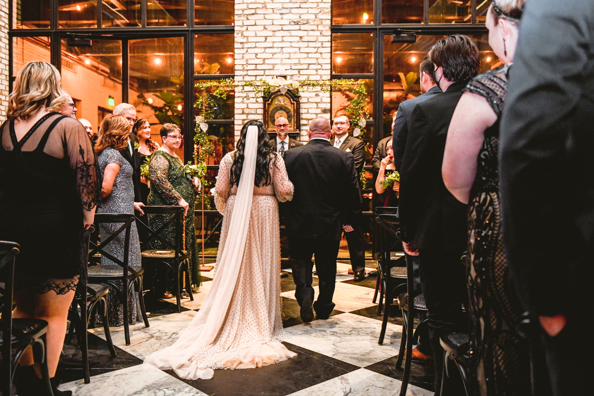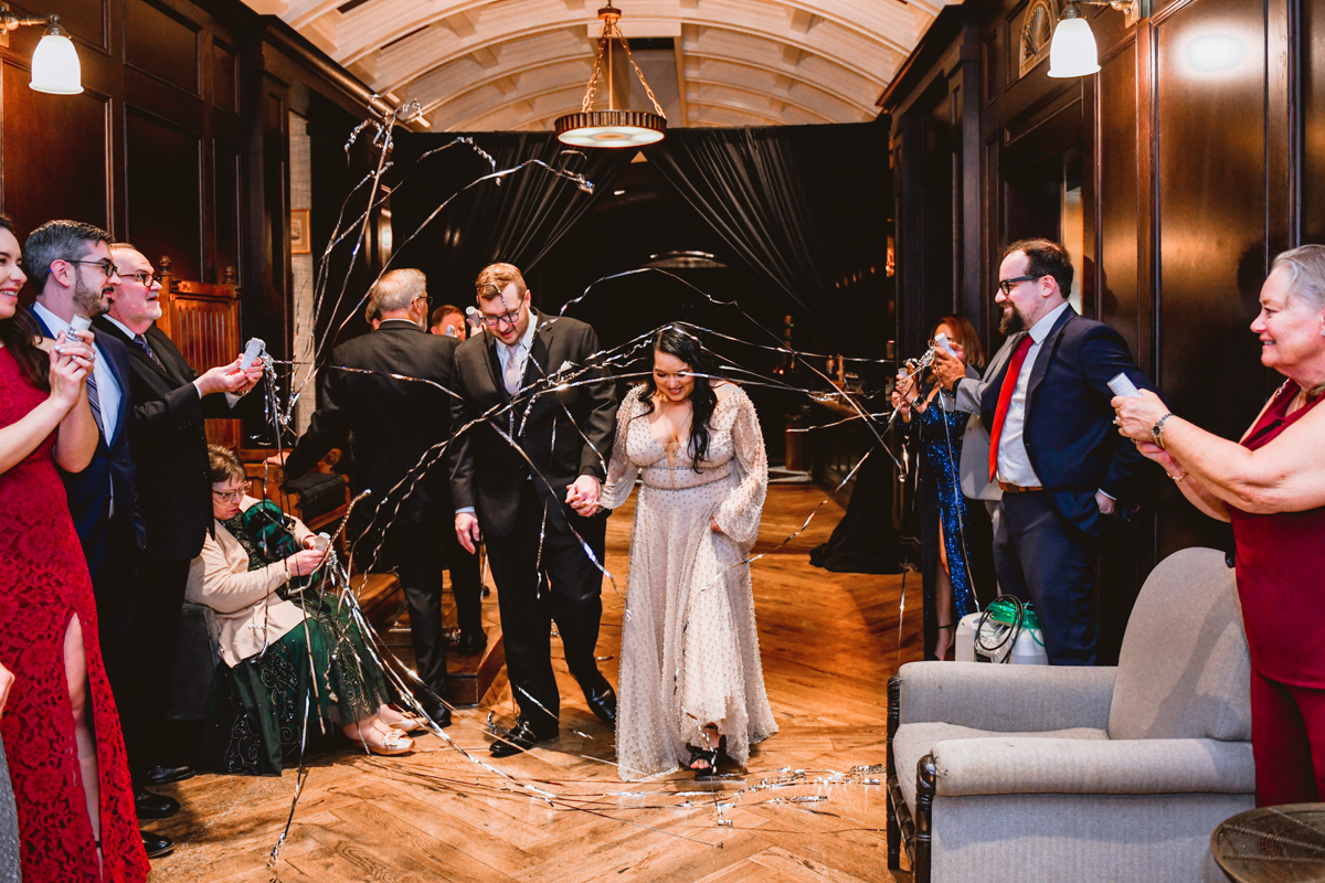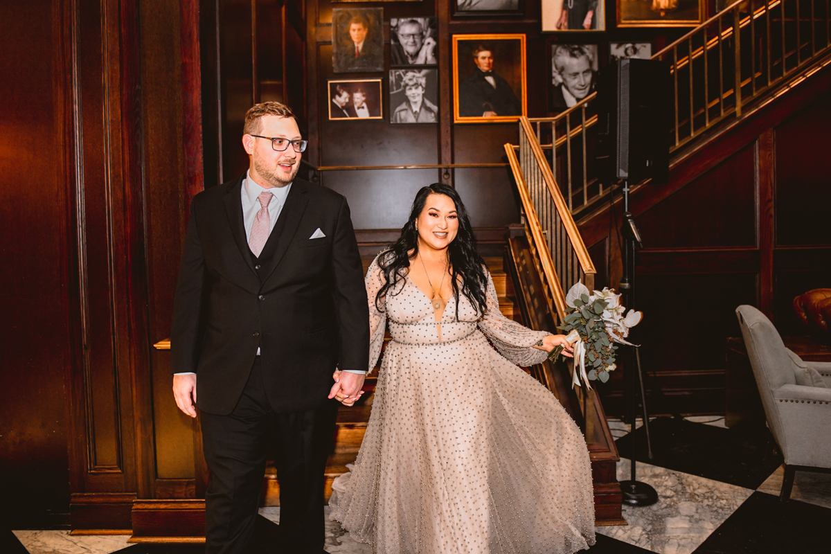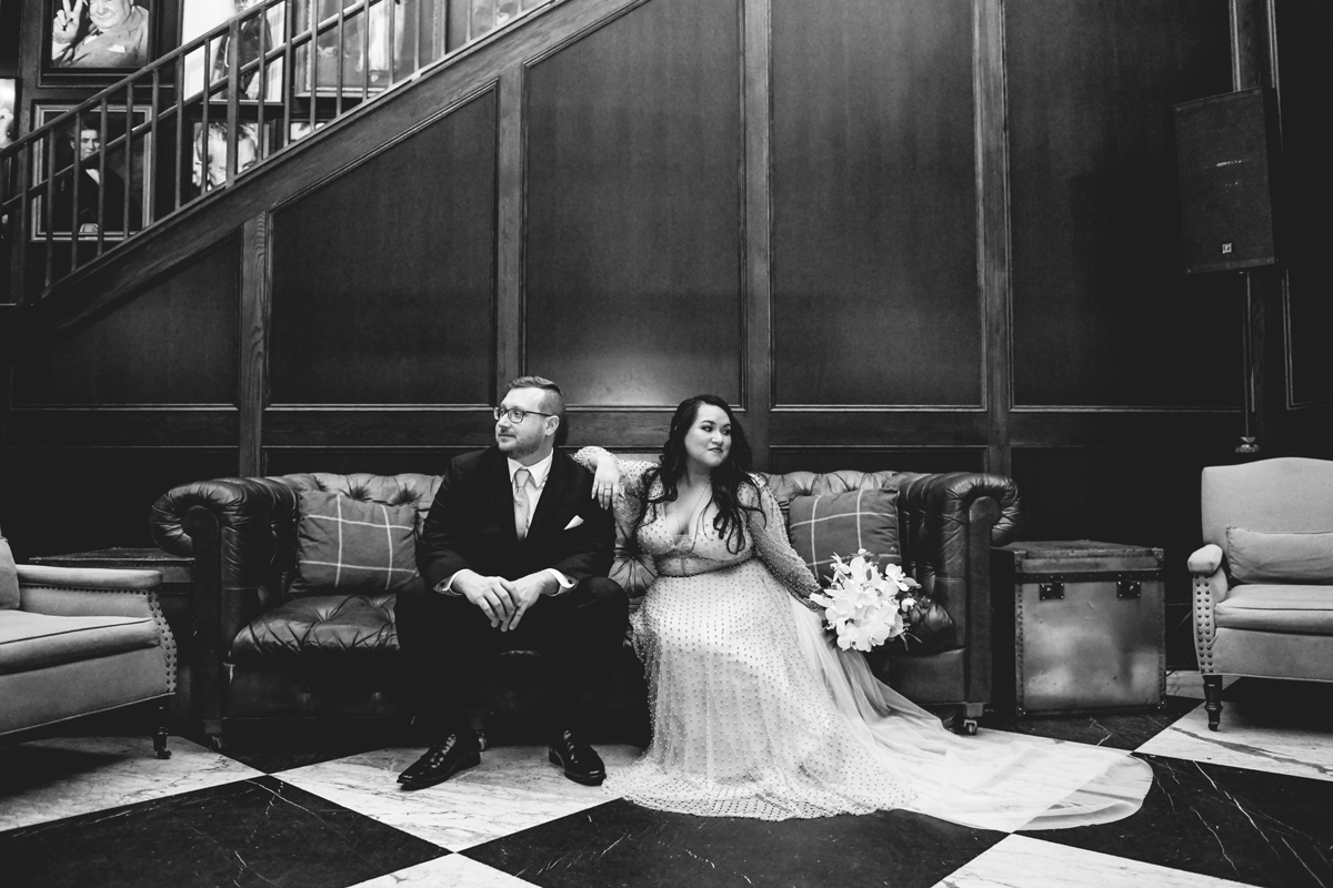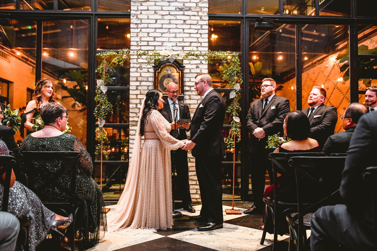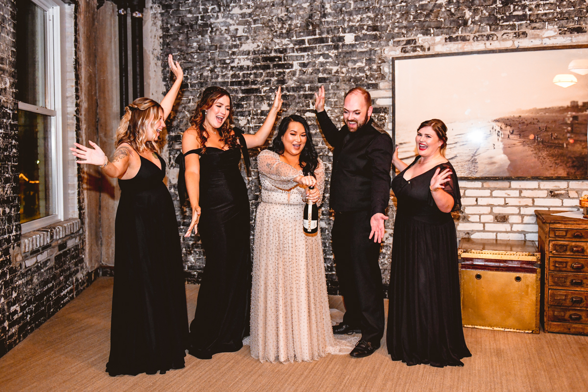 An Oxford Exchange wedding has been on my bucket list of venues to shoot at since I started photographing in the Tampa Bay area. Who hasn’t gone to brunch at Oxford without becoming completely enthralled with every single detail this magical building has to offer? I could only imagine how amazing it would be to photograph a wedding there and then Rachel and Jim stepped into the picture and elevated it. The backstory: I met Rachel a couple of years ago at the salon where we were both getting our hair done. With our hair in and out of processing for 6 hours, there wasn’t much to do but snack and chat so we did! It’s hard to believe meeting Rachel that day would lead me to their wedding day so many years later! I first got to work with Rachel and Jim for their engagement session at Philippe Park. This was just a little insight into what I could expect on their big day and I was super excited. Rachel and I have very similar taste when it comes to style and vibe. We love unique elements all things dark and moody so I knew whatever Rachel had planned for her Oxford Exchange wedding day was going to be something straight from my personal Pinterest board and I wasn’t wrong. From her stunning cream, beaded wedding gown, to the black bridesmaid dresses and cake, Rachel was pulling on all my heart strings. Utilizing all of what Oxford Exchange had to offer for their portraits paired with Rachel’s unique sense of style was truly *chefs kiss*. My favorite part of the evening was when all the guests lined up with confetti poppers as Mr. & Mrs. Watt exited into a luxury car that drove them away into the night. It doesn’t get much better than that folks!