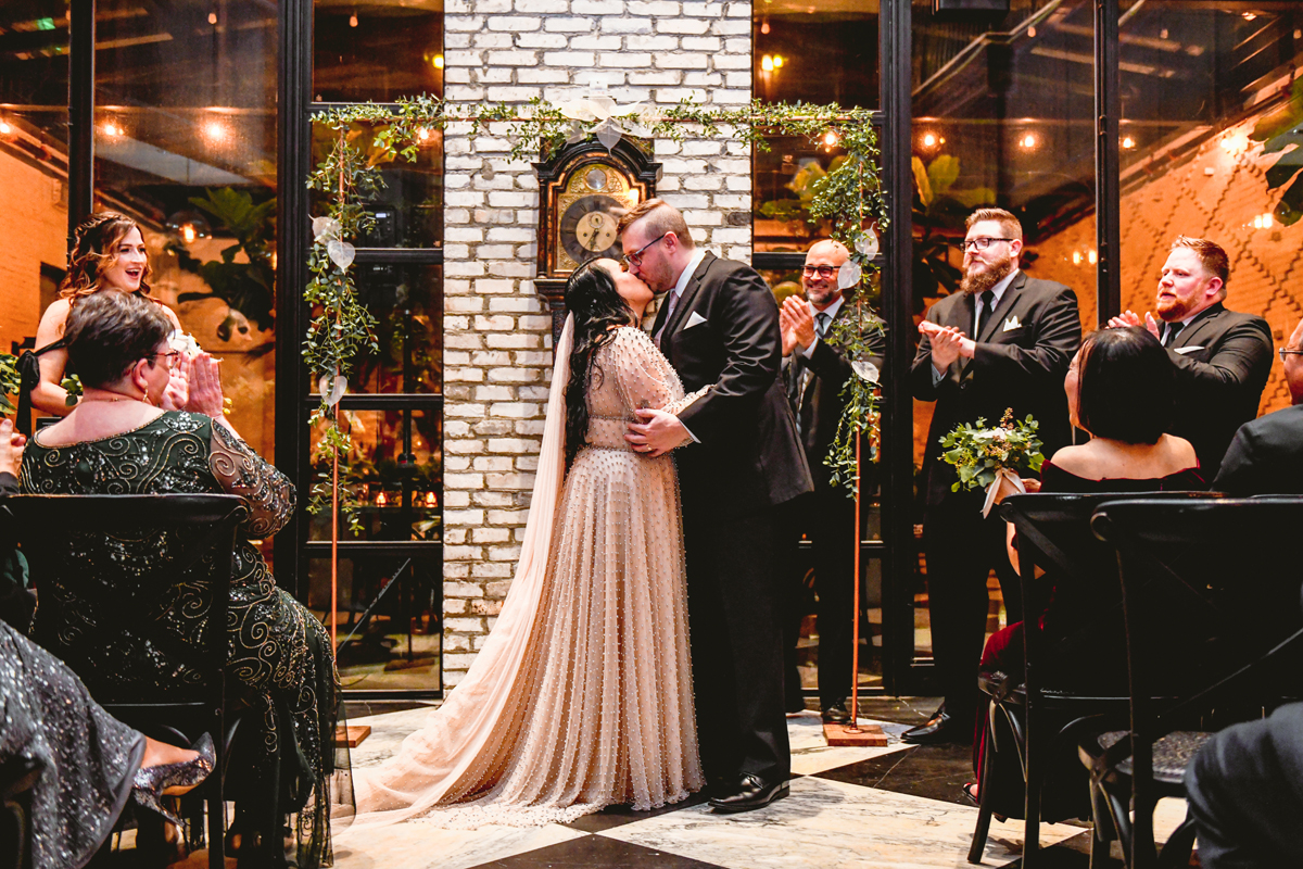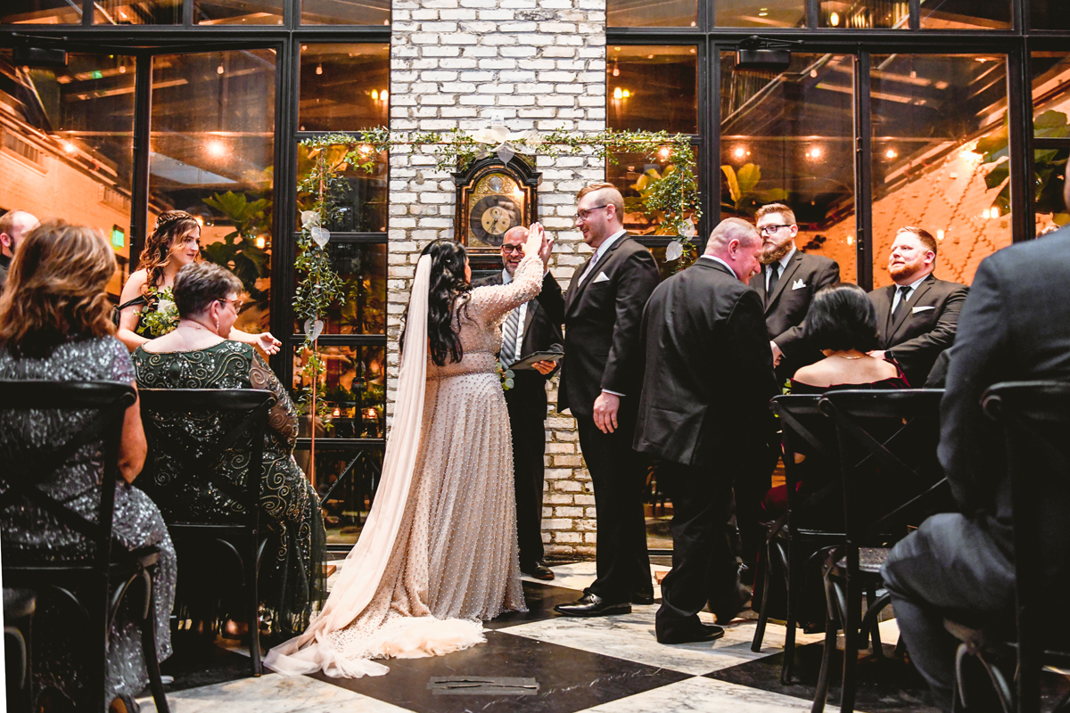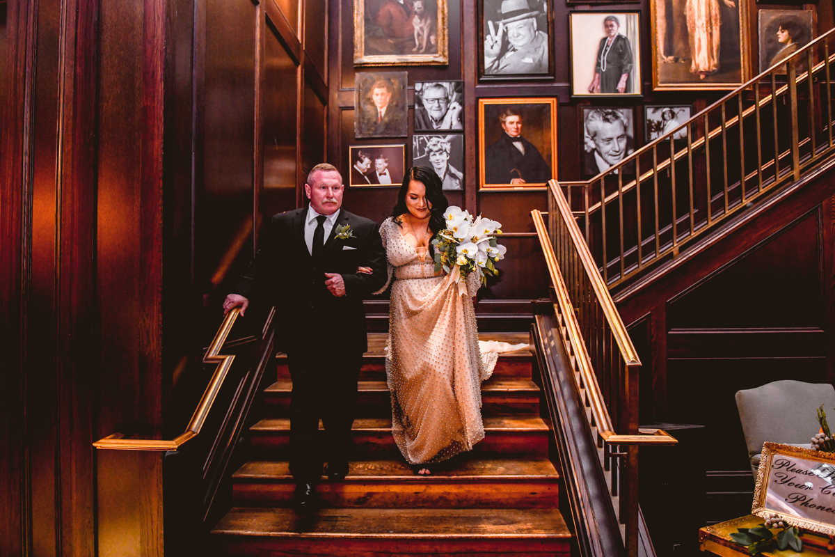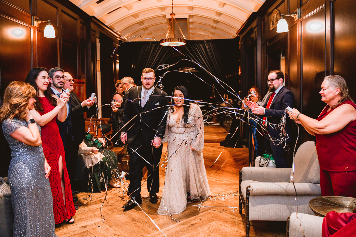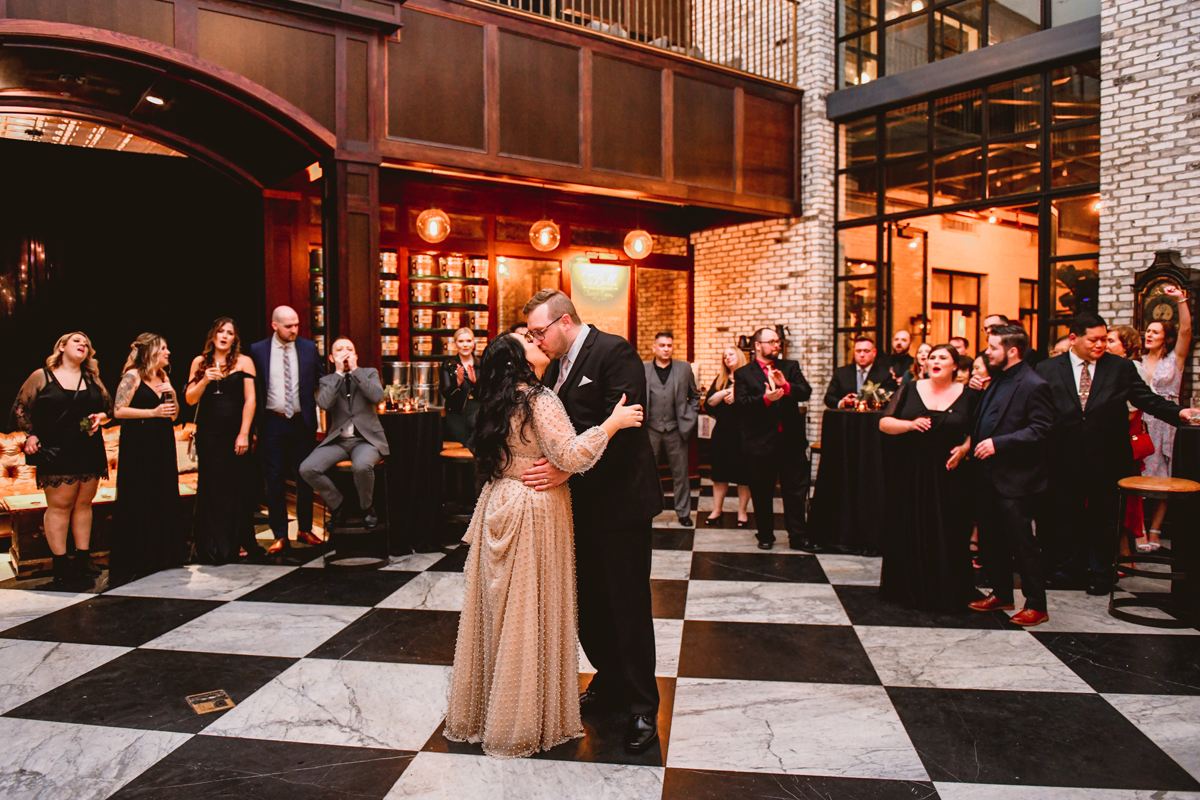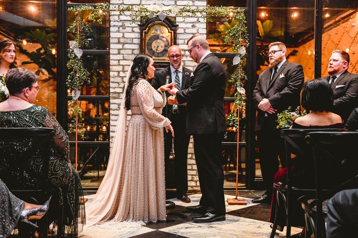 An Oxford Exchange wedding has been on my bucket list of venues to shoot at since I started photographing in the Tampa Bay area. Who hasn’t gone to brunch at Oxford without becoming completely enthralled with every single detail this magical building has to offer? I could only imagine how amazing it would be to photograph a wedding there and then Rachel and Jim stepped into the picture and elevated it. The backstory: I met Rachel a couple of years ago at the salon where we were both getting our hair done. With our hair in and out of processing for 6 hours, there wasn’t much to do but snack and chat so we did! It’s hard to believe meeting Rachel that day would lead me to their wedding day so many years later! I first got to work with Rachel and Jim for their engagement session at Philippe Park. This was just a little insight into what I could expect on their big day and I was super excited. Rachel and I have very similar taste when it comes to style and vibe. We love unique elements all things dark and moody so I knew whatever Rachel had planned for her Oxford Exchange wedding day was going to be something straight from my personal Pinterest board and I wasn’t wrong. From her stunning cream, beaded wedding gown, to the black bridesmaid dresses and cake, Rachel was pulling on all my heart strings. Utilizing all of what Oxford Exchange had to offer for their portraits paired with Rachel’s unique sense of style was truly *chefs kiss*. My favorite part of the evening was when all the guests lined up with confetti poppers as Mr. & Mrs. Watt exited into a luxury car that drove them away into the night. It doesn’t get much better than that folks!