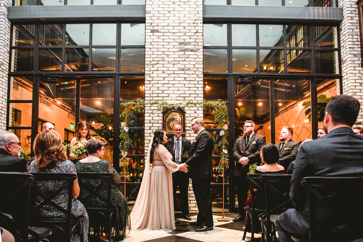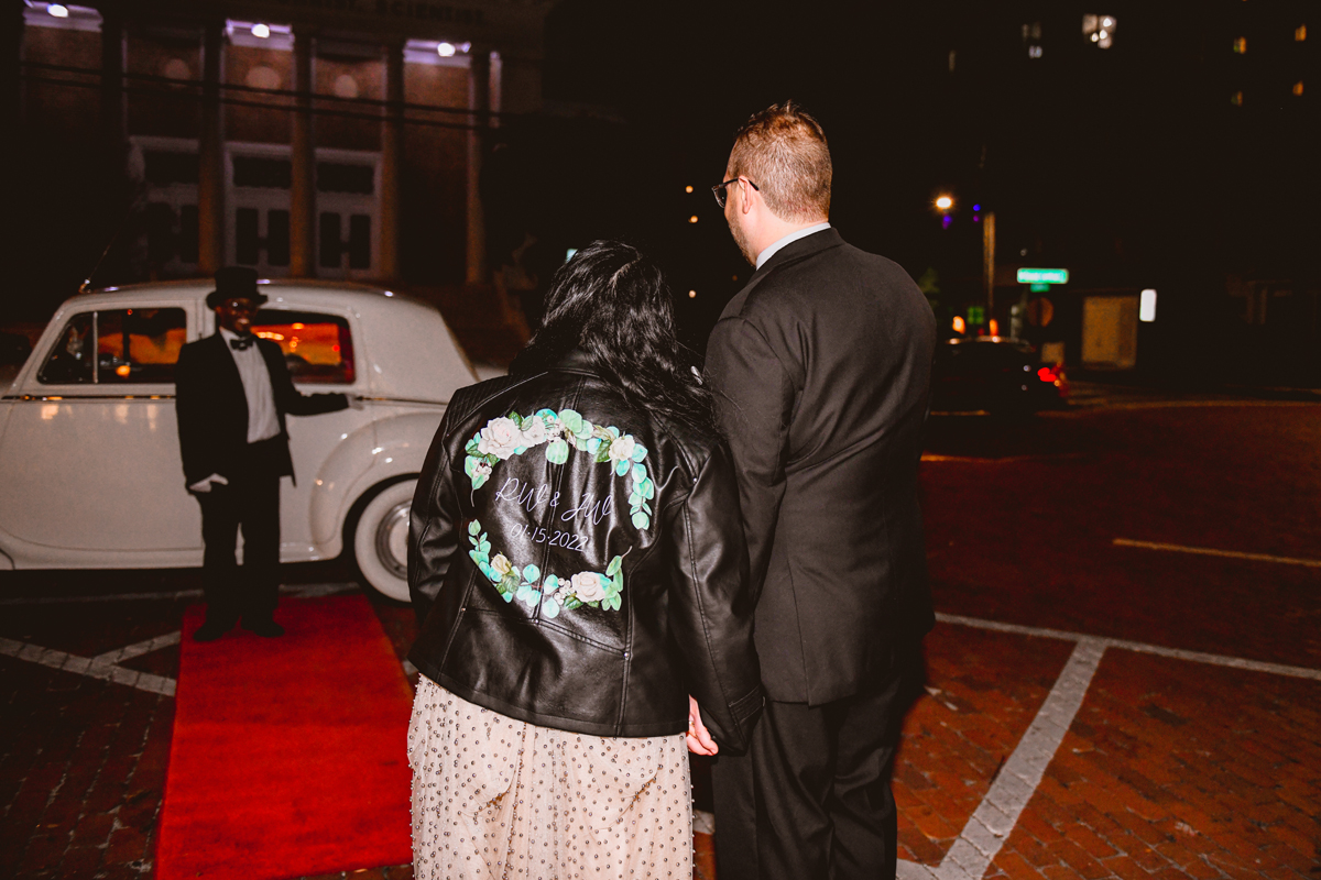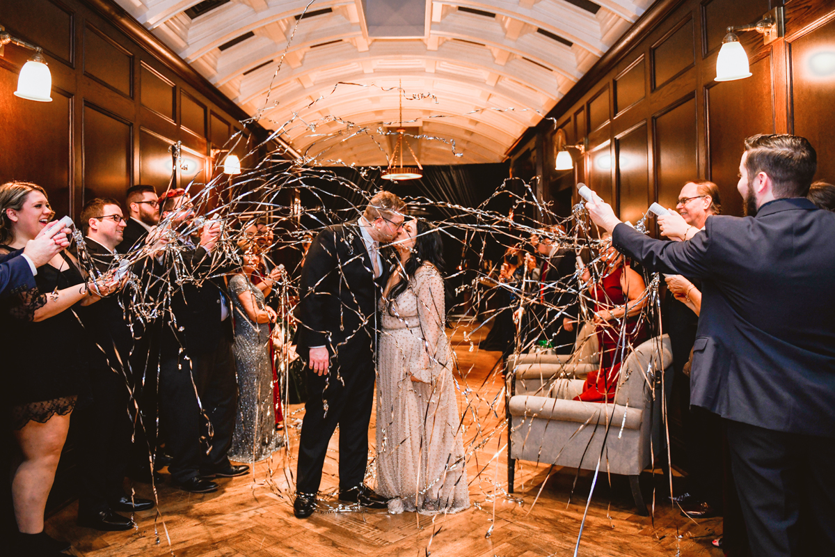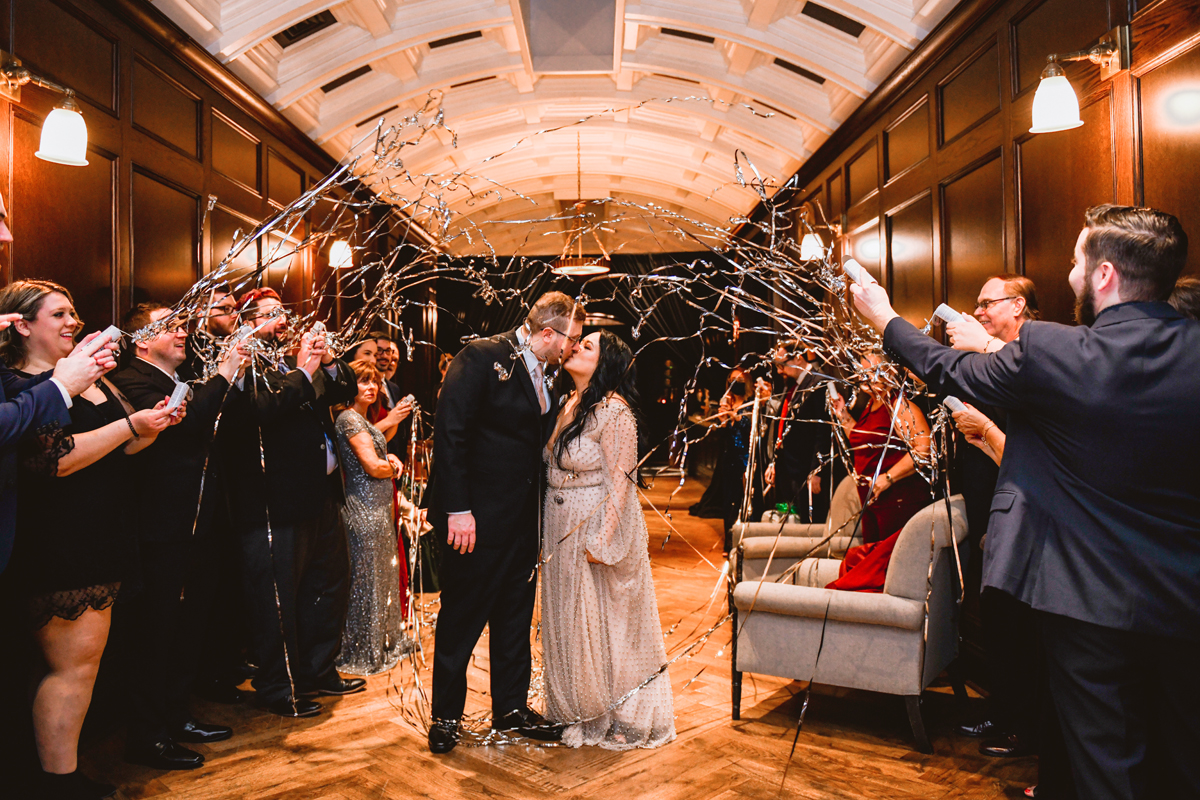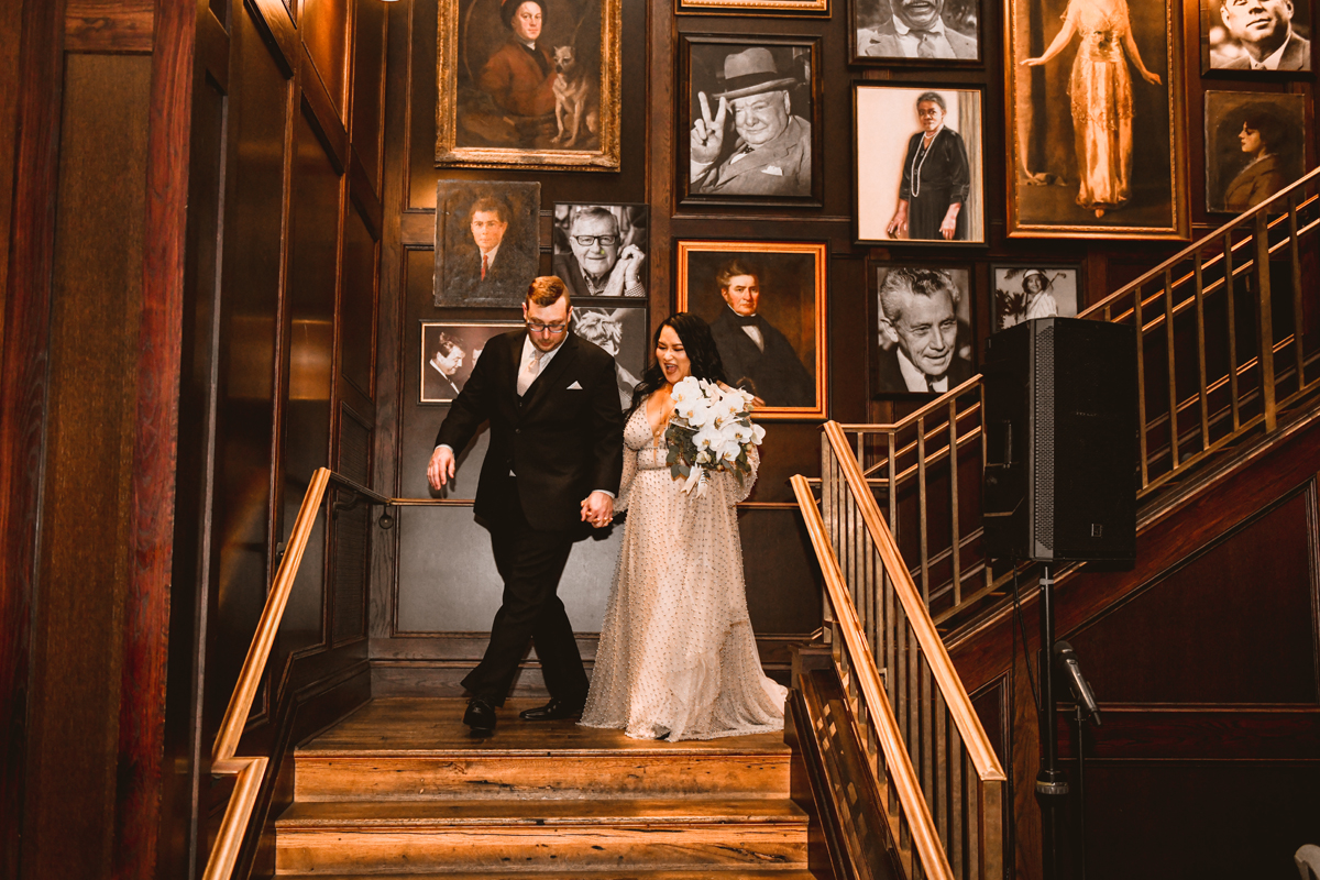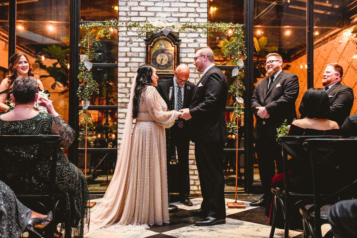 An Oxford Exchange wedding has been on my bucket list of venues to shoot at since I started photographing in the Tampa Bay area. Who hasn’t gone to brunch at Oxford without becoming completely enthralled with every single detail this magical building has to offer? I could only imagine how amazing it would be to photograph a wedding there and then Rachel and Jim stepped into the picture and elevated it. The backstory: I met Rachel a couple of years ago at the salon where we were both getting our hair done. With our hair in and out of processing for 6 hours, there wasn’t much to do but snack and chat so we did! It’s hard to believe meeting Rachel that day would lead me to their wedding day so many years later! I first got to work with Rachel and Jim for their engagement session at Philippe Park. This was just a little insight into what I could expect on their big day and I was super excited. Rachel and I have very similar taste when it comes to style and vibe. We love unique elements all things dark and moody so I knew whatever Rachel had planned for her Oxford Exchange wedding day was going to be something straight from my personal Pinterest board and I wasn’t wrong. From her stunning cream, beaded wedding gown, to the black bridesmaid dresses and cake, Rachel was pulling on all my heart strings. Utilizing all of what Oxford Exchange had to offer for their portraits paired with Rachel’s unique sense of style was truly *chefs kiss*. My favorite part of the evening was when all the guests lined up with confetti poppers as Mr. & Mrs. Watt exited into a luxury car that drove them away into the night. It doesn’t get much better than that folks!