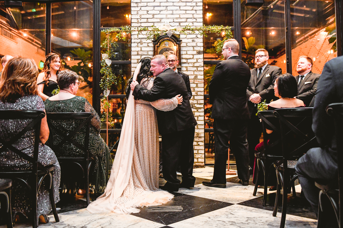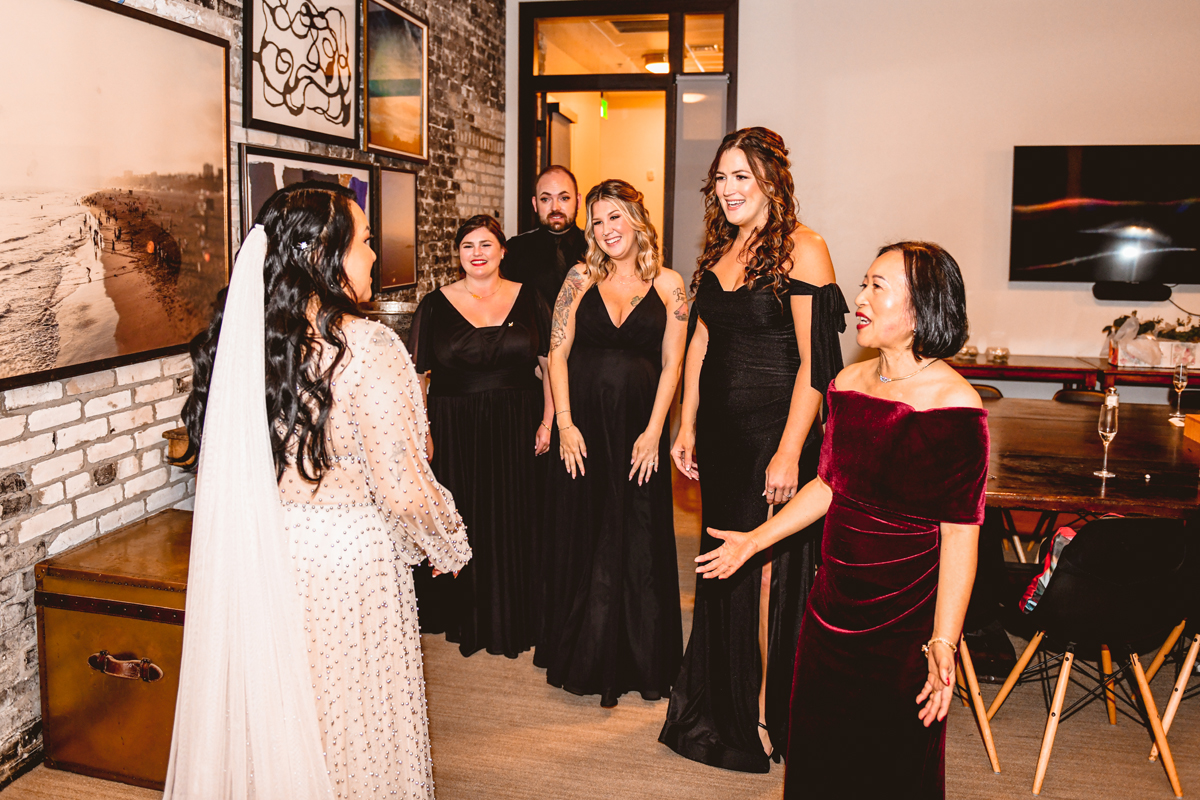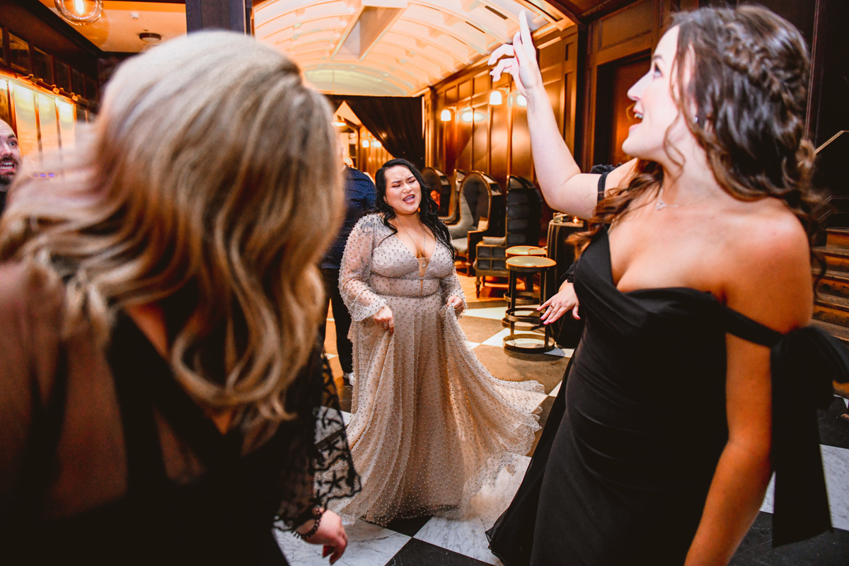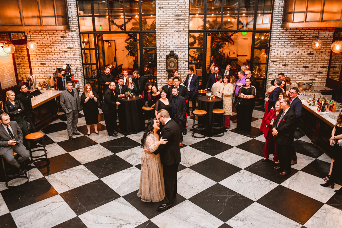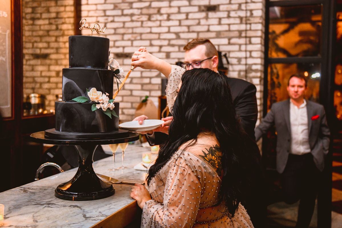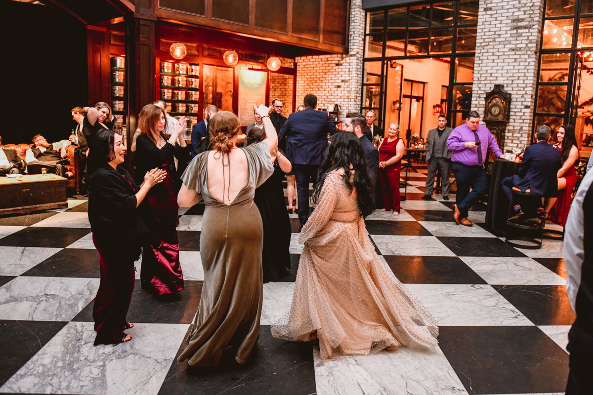 An Oxford Exchange wedding has been on my bucket list of venues to shoot at since I started photographing in the Tampa Bay area. Who hasn’t gone to brunch at Oxford without becoming completely enthralled with every single detail this magical building has to offer? I could only imagine how amazing it would be to photograph a wedding there and then Rachel and Jim stepped into the picture and elevated it. The backstory: I met Rachel a couple of years ago at the salon where we were both getting our hair done. With our hair in and out of processing for 6 hours, there wasn’t much to do but snack and chat so we did! It’s hard to believe meeting Rachel that day would lead me to their wedding day so many years later! I first got to work with Rachel and Jim for their engagement session at Philippe Park. This was just a little insight into what I could expect on their big day and I was super excited. Rachel and I have very similar taste when it comes to style and vibe. We love unique elements all things dark and moody so I knew whatever Rachel had planned for her Oxford Exchange wedding day was going to be something straight from my personal Pinterest board and I wasn’t wrong. From her stunning cream, beaded wedding gown, to the black bridesmaid dresses and cake, Rachel was pulling on all my heart strings. Utilizing all of what Oxford Exchange had to offer for their portraits paired with Rachel’s unique sense of style was truly *chefs kiss*. My favorite part of the evening was when all the guests lined up with confetti poppers as Mr. & Mrs. Watt exited into a luxury car that drove them away into the night. It doesn’t get much better than that folks!