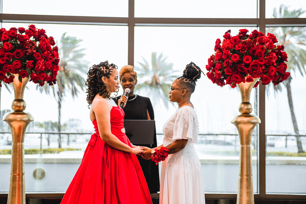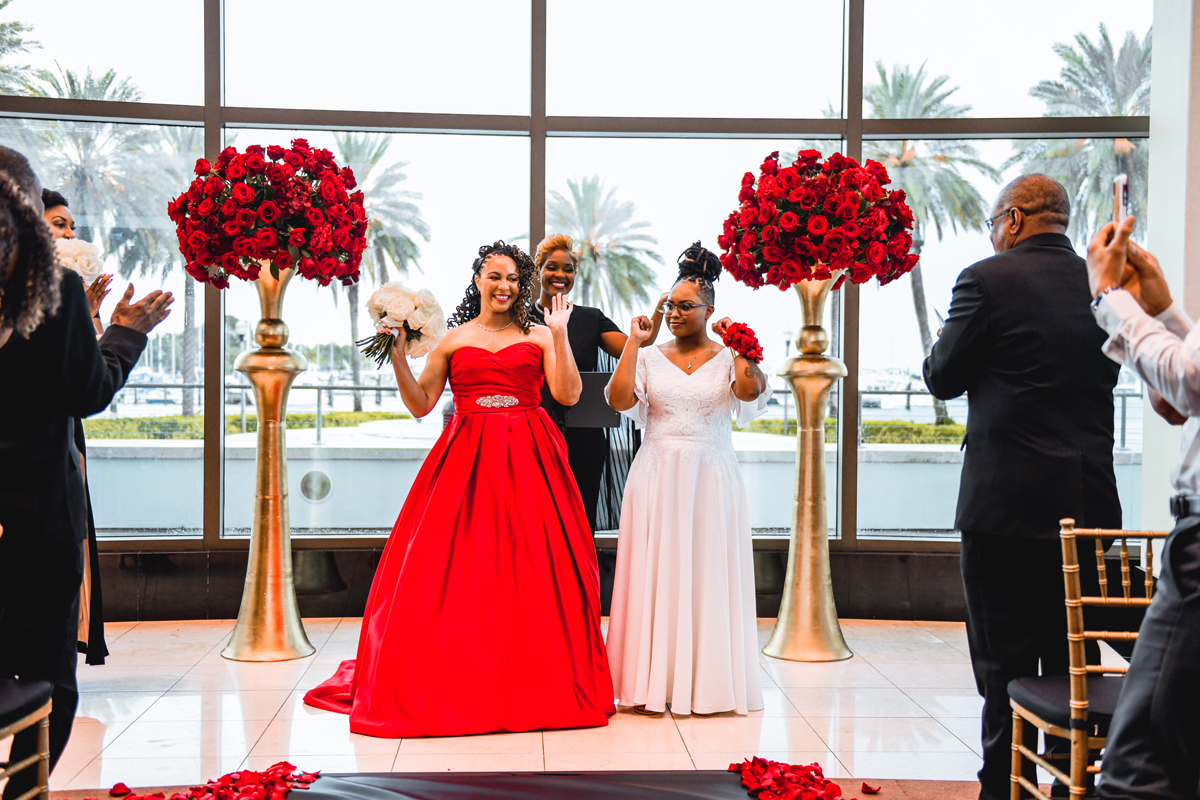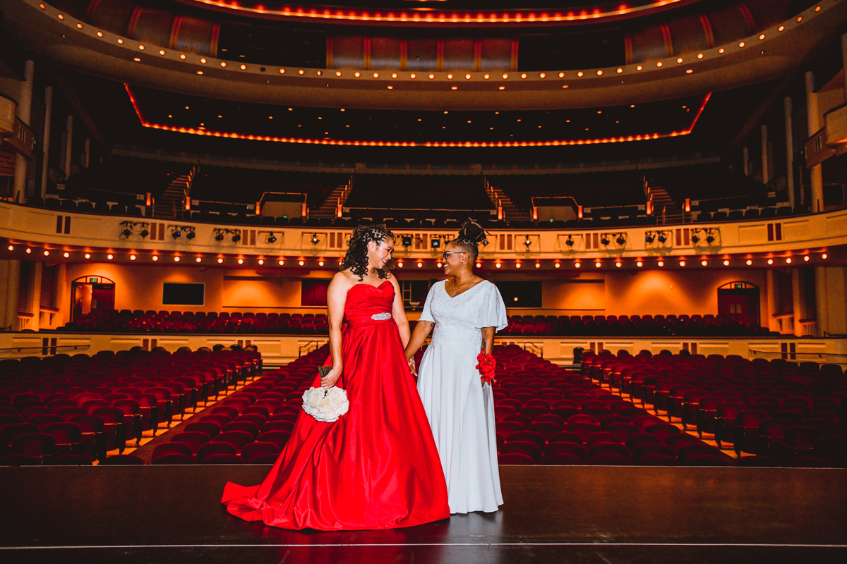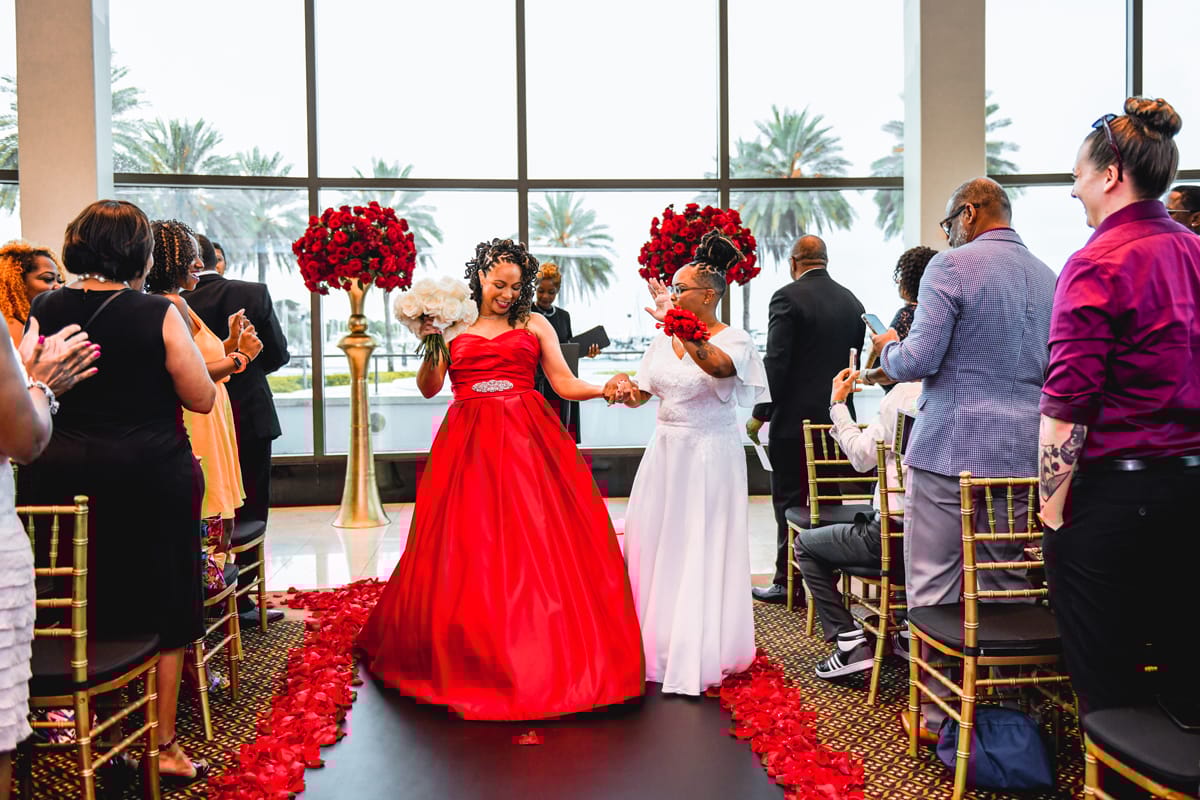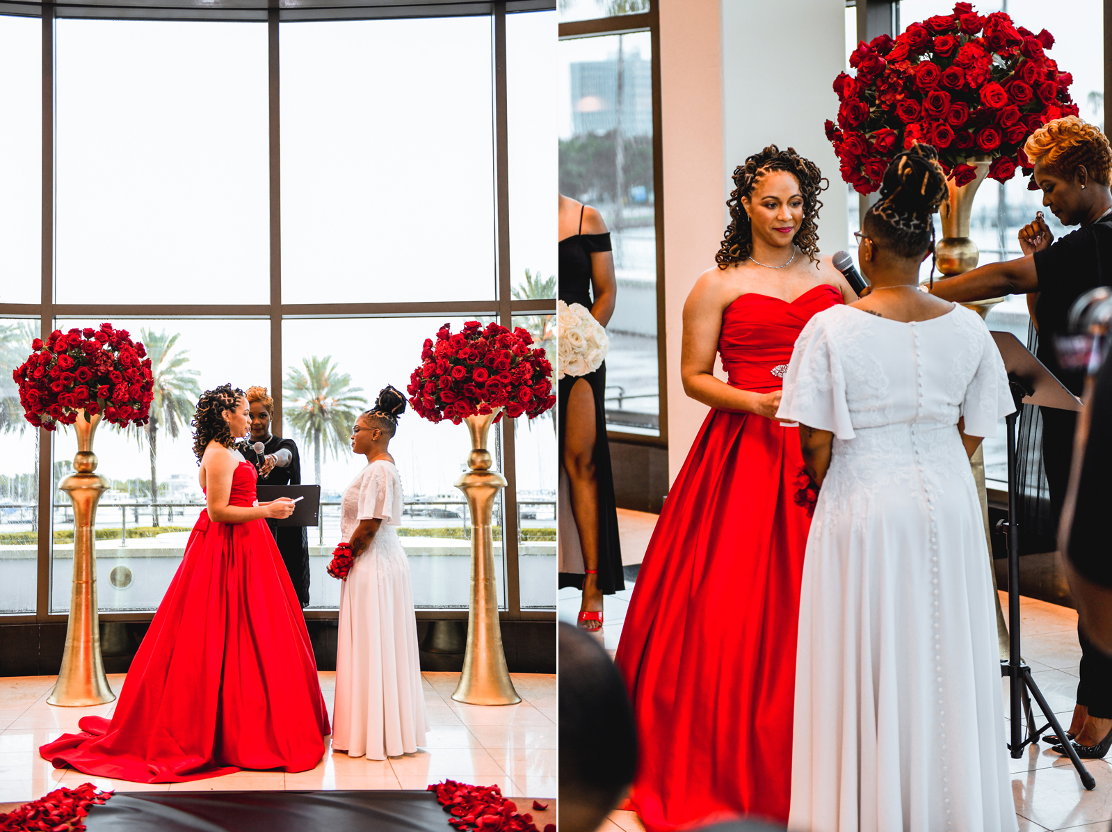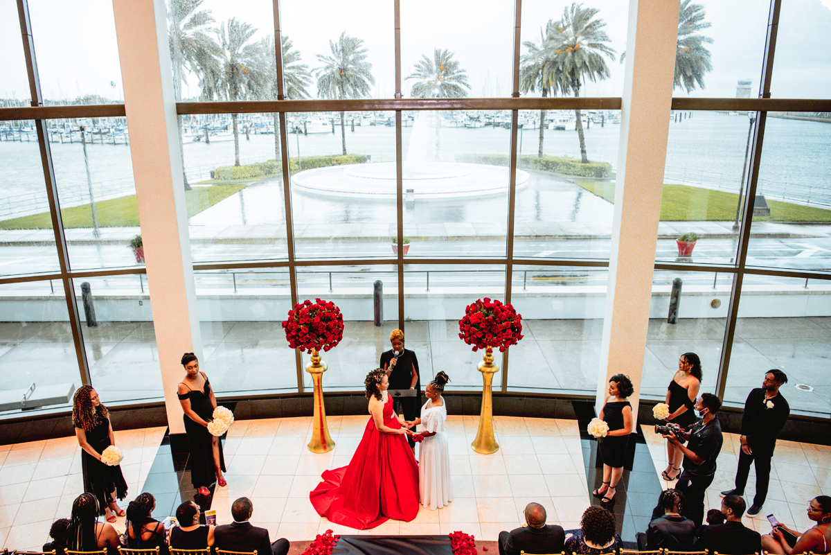 I first met Tiffiny and Jordyn at their Ybor engagement session and knew right off the bat their Mahaffey Theater wedding day was going to be epic. That was an understatement to say the least. Combining forces with Staci of UNIQUE Weddings and Events, the brain child that was Tiffiny and Jordyn’s wedding vision was executed flawlessly and is probably one of the most beautiful weddings I’ve photographed to date. Peep the reception detail shots to see what I’m talking about, but I’ll start back at the beginning. I spent the morning with Tiffiny and Jordyn as they both got ready together until they went in separate rooms to get dressed prior to their first look. I loved that they got to share their wedding morning together but still kept the tradition of waiting to see each other in their wedding dresses until their first look. After their first look in the hotel we migrated across the street to the Mahaffey Theater and took some show stopping portraits on the theater stage as we waited for guests to arrive for the ceremony. Perks of having a Mahaffey Theater wedding! The ceremony took place in front east facing windows looking out towards the bay and all the sailboats in the harbor. An afternoon thunderstorm had rolled in so the added dramatics of a lightning striking all around was a big hit with the guests. After a surprise musical guest during the vows and the rings were exchanged, Tiffiny and Jordyn became wife and wife and danced all the way back down the aisle. The rest of the evening was filled with a stunning custom dessert station, dinner, drinks and lots of dancing. Congrats Tiffiny and Jordyn, I’m so happy I got to capture this day for you!