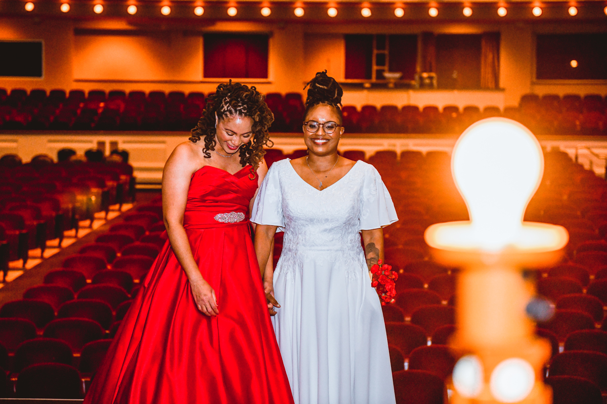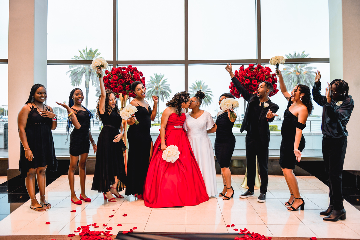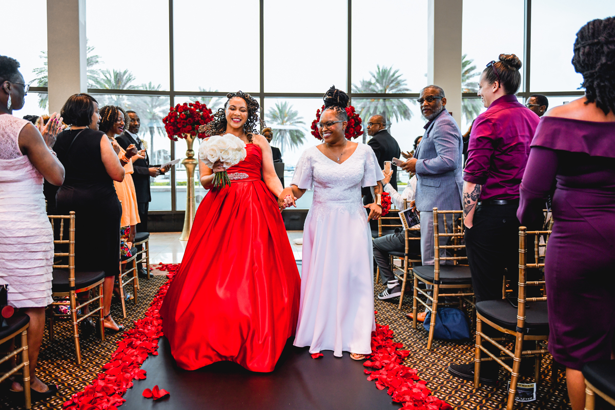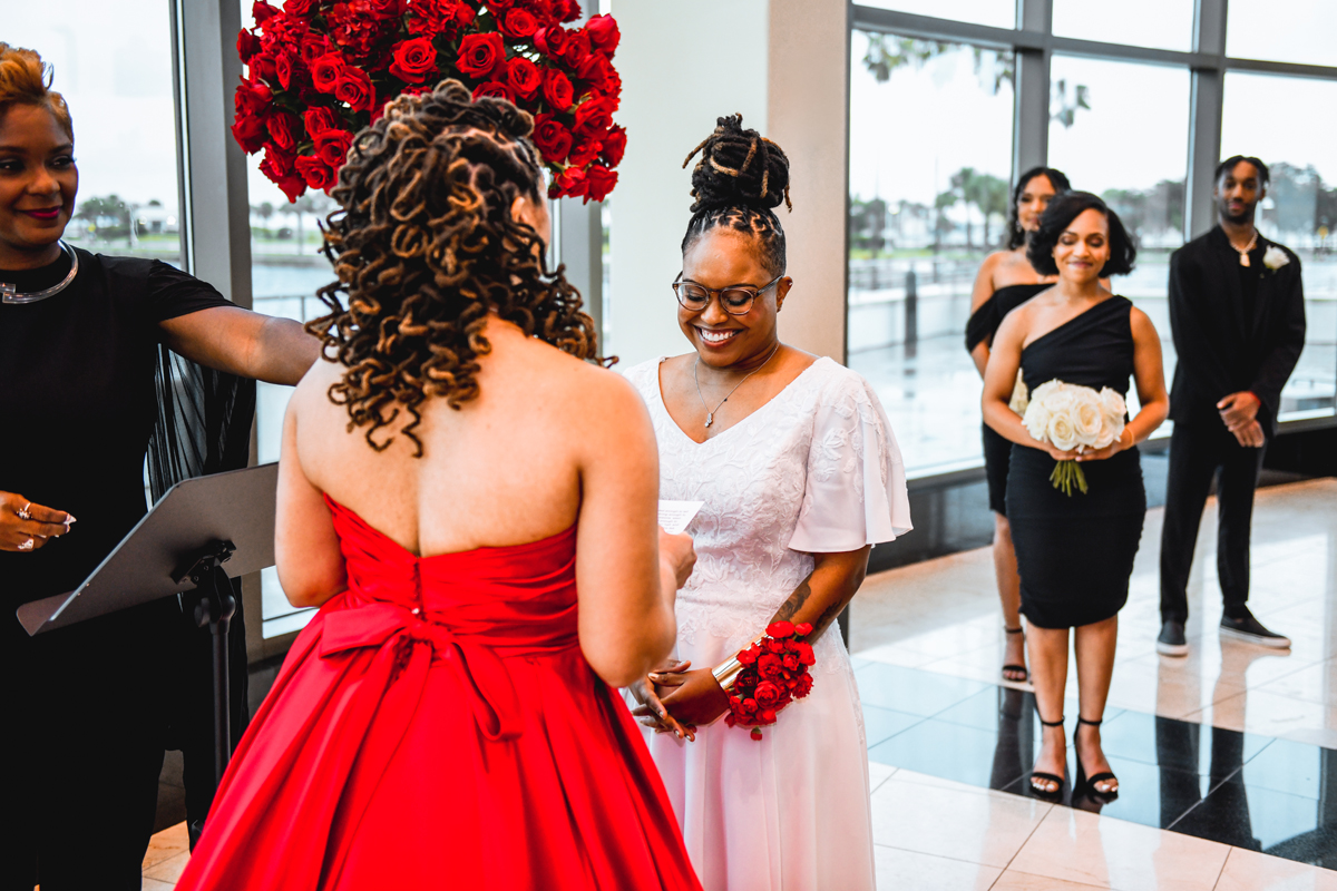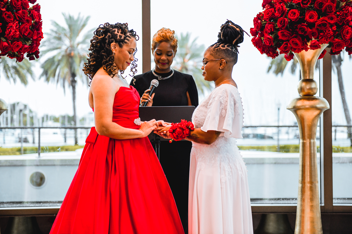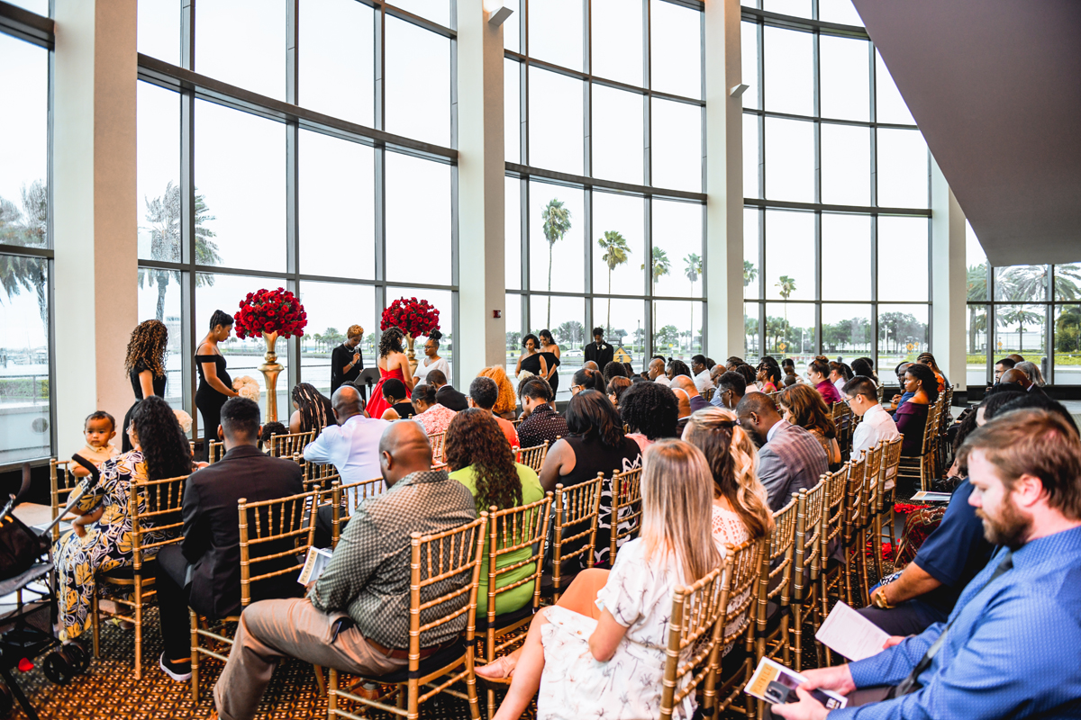 I first met Tiffiny and Jordyn at their Ybor engagement session and knew right off the bat their Mahaffey Theater wedding day was going to be epic. That was an understatement to say the least. Combining forces with Staci of UNIQUE Weddings and Events, the brain child that was Tiffiny and Jordyn’s wedding vision was executed flawlessly and is probably one of the most beautiful weddings I’ve photographed to date. Peep the reception detail shots to see what I’m talking about, but I’ll start back at the beginning. I spent the morning with Tiffiny and Jordyn as they both got ready together until they went in separate rooms to get dressed prior to their first look. I loved that they got to share their wedding morning together but still kept the tradition of waiting to see each other in their wedding dresses until their first look. After their first look in the hotel we migrated across the street to the Mahaffey Theater and took some show stopping portraits on the theater stage as we waited for guests to arrive for the ceremony. Perks of having a Mahaffey Theater wedding! The ceremony took place in front east facing windows looking out towards the bay and all the sailboats in the harbor. An afternoon thunderstorm had rolled in so the added dramatics of a lightning striking all around was a big hit with the guests. After a surprise musical guest during the vows and the rings were exchanged, Tiffiny and Jordyn became wife and wife and danced all the way back down the aisle. The rest of the evening was filled with a stunning custom dessert station, dinner, drinks and lots of dancing. Congrats Tiffiny and Jordyn, I’m so happy I got to capture this day for you!