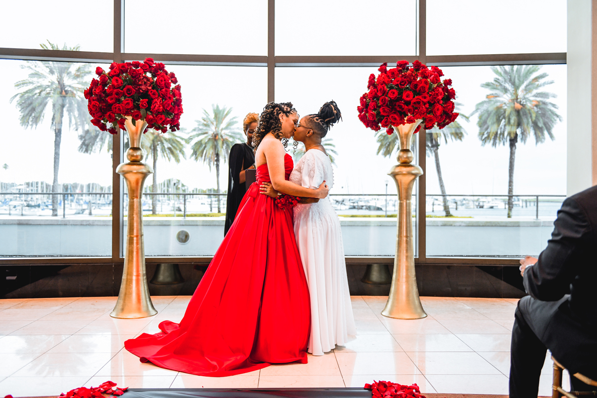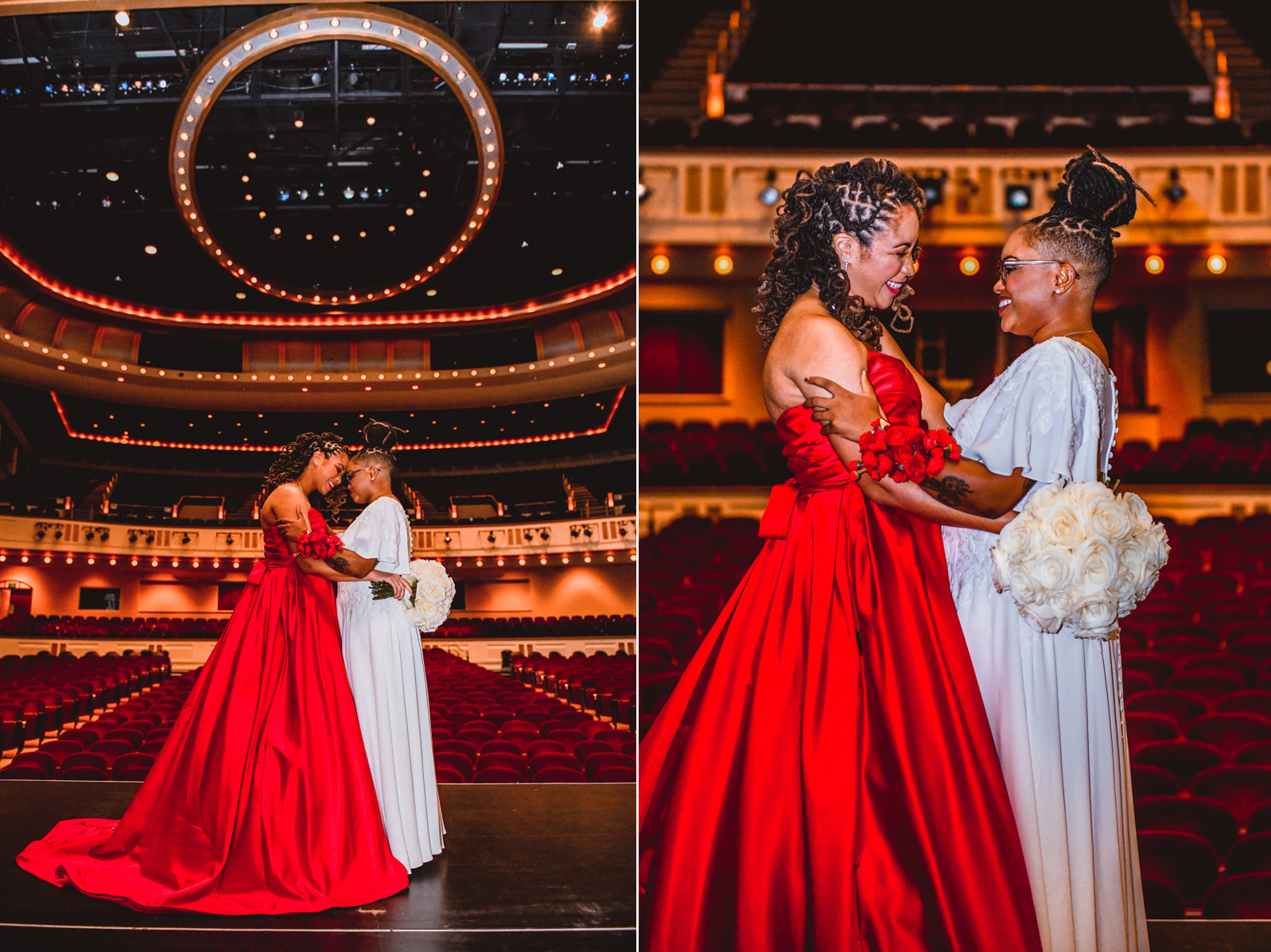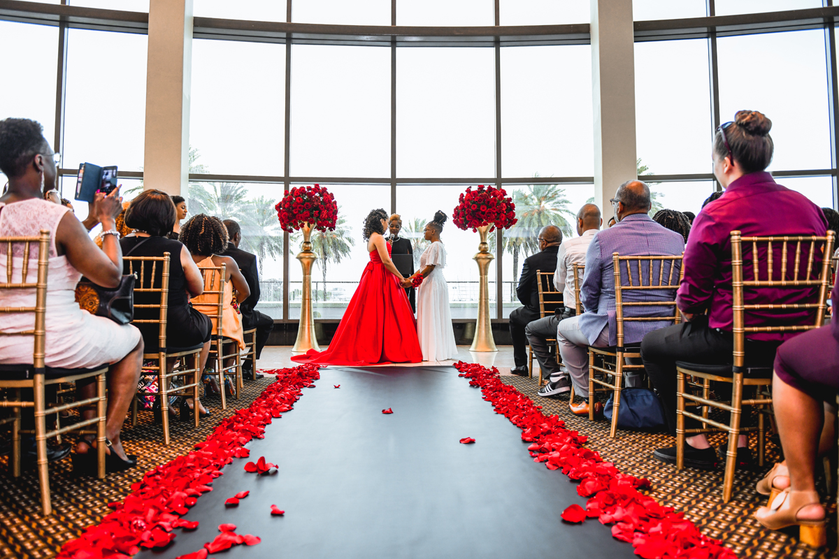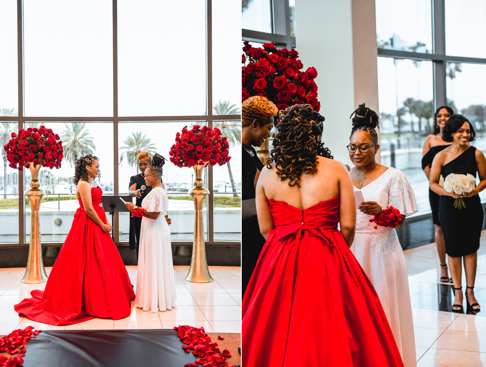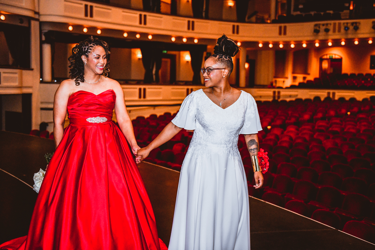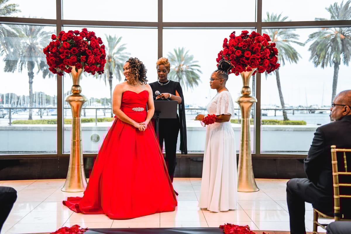 I first met Tiffiny and Jordyn at their Ybor engagement session and knew right off the bat their Mahaffey Theater wedding day was going to be epic. That was an understatement to say the least. Combining forces with Staci of UNIQUE Weddings and Events, the brain child that was Tiffiny and Jordyn’s wedding vision was executed flawlessly and is probably one of the most beautiful weddings I’ve photographed to date. Peep the reception detail shots to see what I’m talking about, but I’ll start back at the beginning. I spent the morning with Tiffiny and Jordyn as they both got ready together until they went in separate rooms to get dressed prior to their first look. I loved that they got to share their wedding morning together but still kept the tradition of waiting to see each other in their wedding dresses until their first look. After their first look in the hotel we migrated across the street to the Mahaffey Theater and took some show stopping portraits on the theater stage as we waited for guests to arrive for the ceremony. Perks of having a Mahaffey Theater wedding! The ceremony took place in front east facing windows looking out towards the bay and all the sailboats in the harbor. An afternoon thunderstorm had rolled in so the added dramatics of a lightning striking all around was a big hit with the guests. After a surprise musical guest during the vows and the rings were exchanged, Tiffiny and Jordyn became wife and wife and danced all the way back down the aisle. The rest of the evening was filled with a stunning custom dessert station, dinner, drinks and lots of dancing. Congrats Tiffiny and Jordyn, I’m so happy I got to capture this day for you!